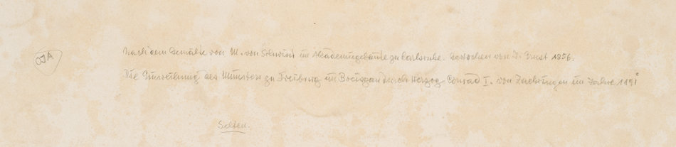 - Bezeichnung: Unterhalb der Darstellung signiert und bezeichnet: “Fresco Gemälde von M. v. Schwind im Academie Gebäude zu Carlsruhe”, “Nach dem Carton gest. von J. Ernst unter der Leitung v. J.[ulius Caesar] Thäter”, darunter “Die Einweihung des Münsters zu Freiburg im Breisgau durch Herzog Conrad I von Zaehringen, im Jahre 1191.” und “Vom oesterreichischen Kunstverein in Wien 1857”