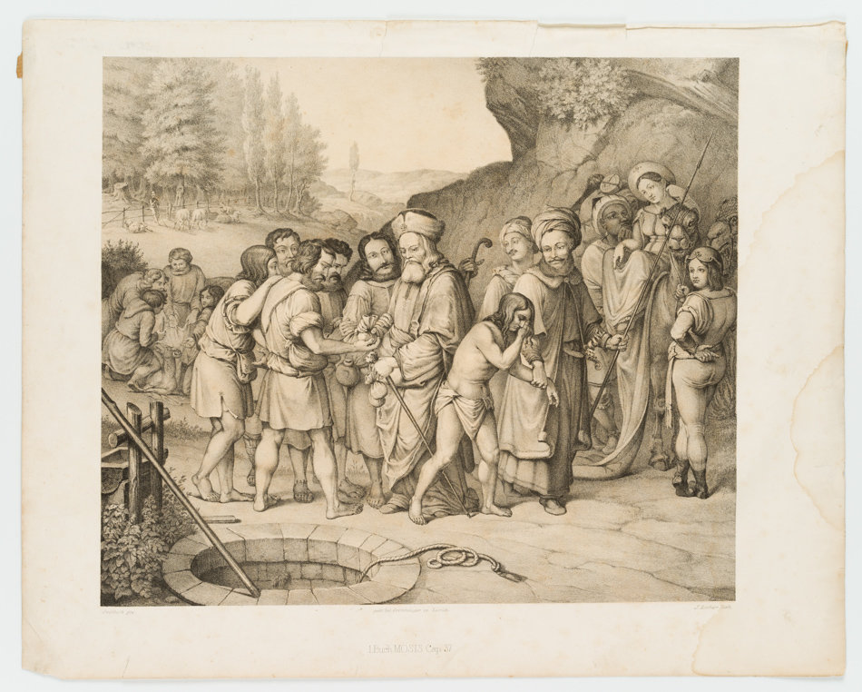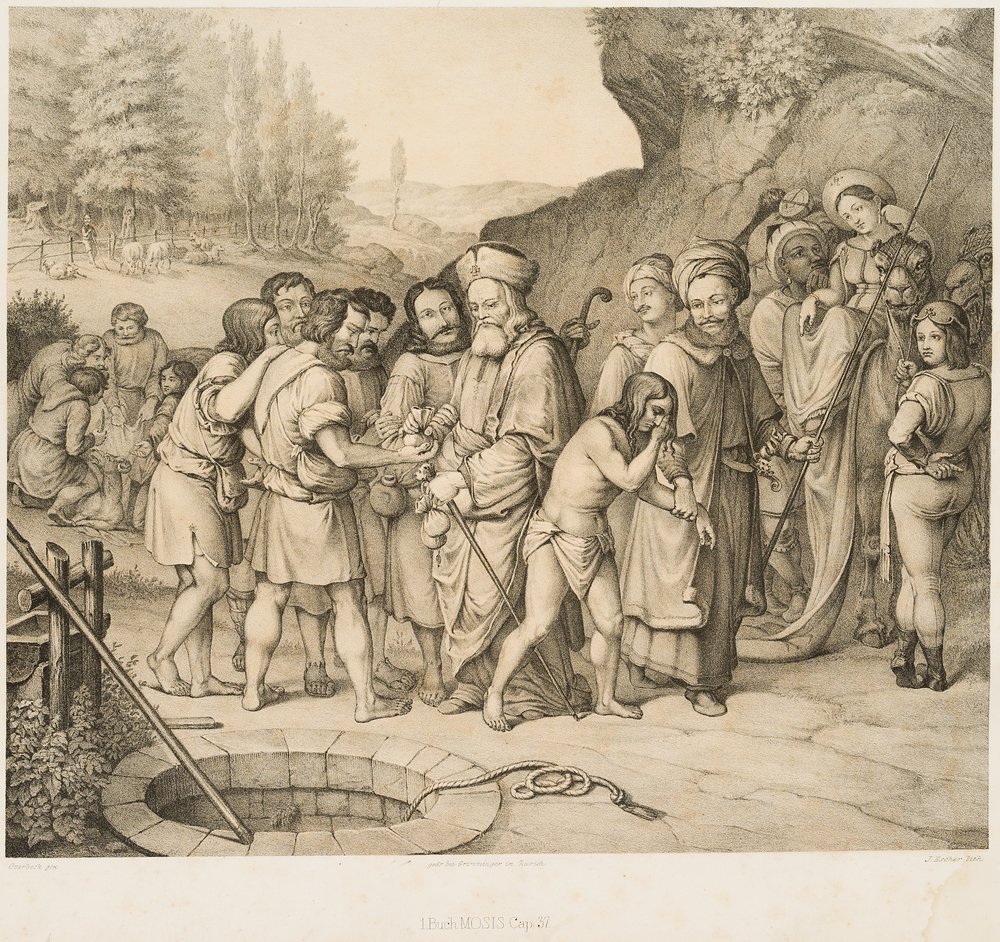- Bezeichnung: Unterhalb der Darstellung signiert und bezeichnet: “Overbeck gez. | gedr. bei Grimminger in Zürich | J. Escher lith.” und “1. Buch Mosis Cap. 37”