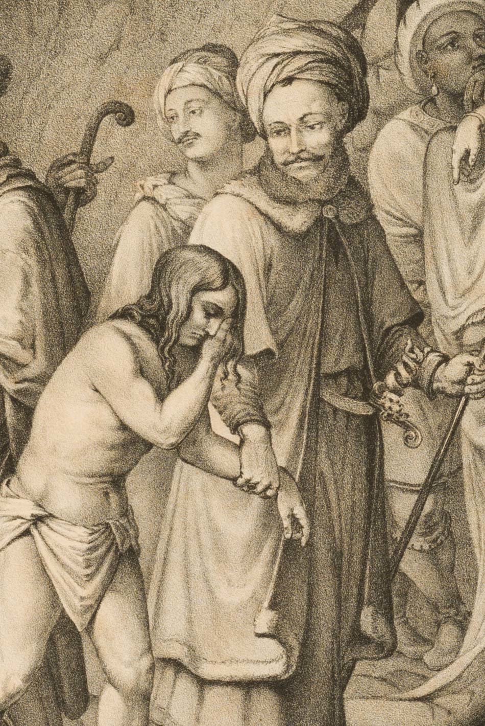 Hans Jakob Escher (19. Jahrhundert) nach Friedrich Overbeck (1789 Lübeck – 1869 Rom), Josef wird von seinen Brüdern nach Ägypten verkauft, um 1840, Lithographie