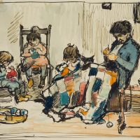 - Description: Confined to a corner of the room, we see mother and children crocheting together with their heads bowed and needlework on their laps. Absorbed in themselves, each family member devotes himself to his handiwork. It is so quiet that we could hear a wall clock ticking or the fire crackling in the fireplace. A peaceful tranquillity and familial warmth radiates from this interior scene, which is also emphasised in terms of colour by the warm ochre tones in the patchwork ceiling and floor.