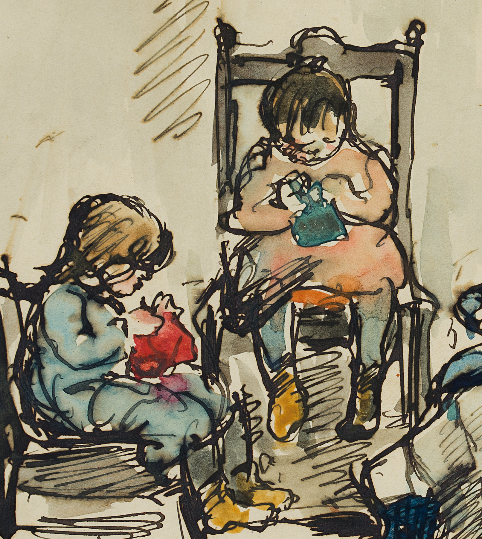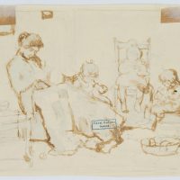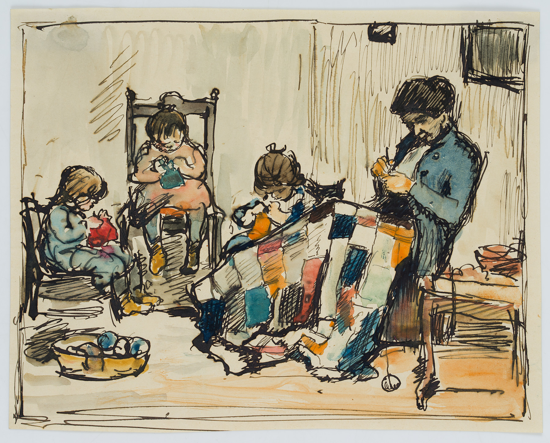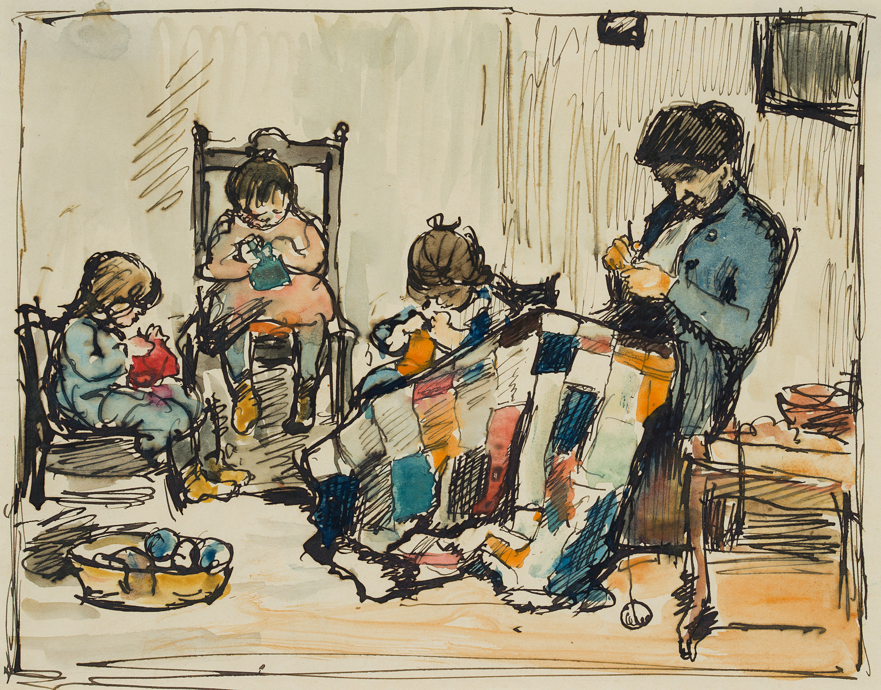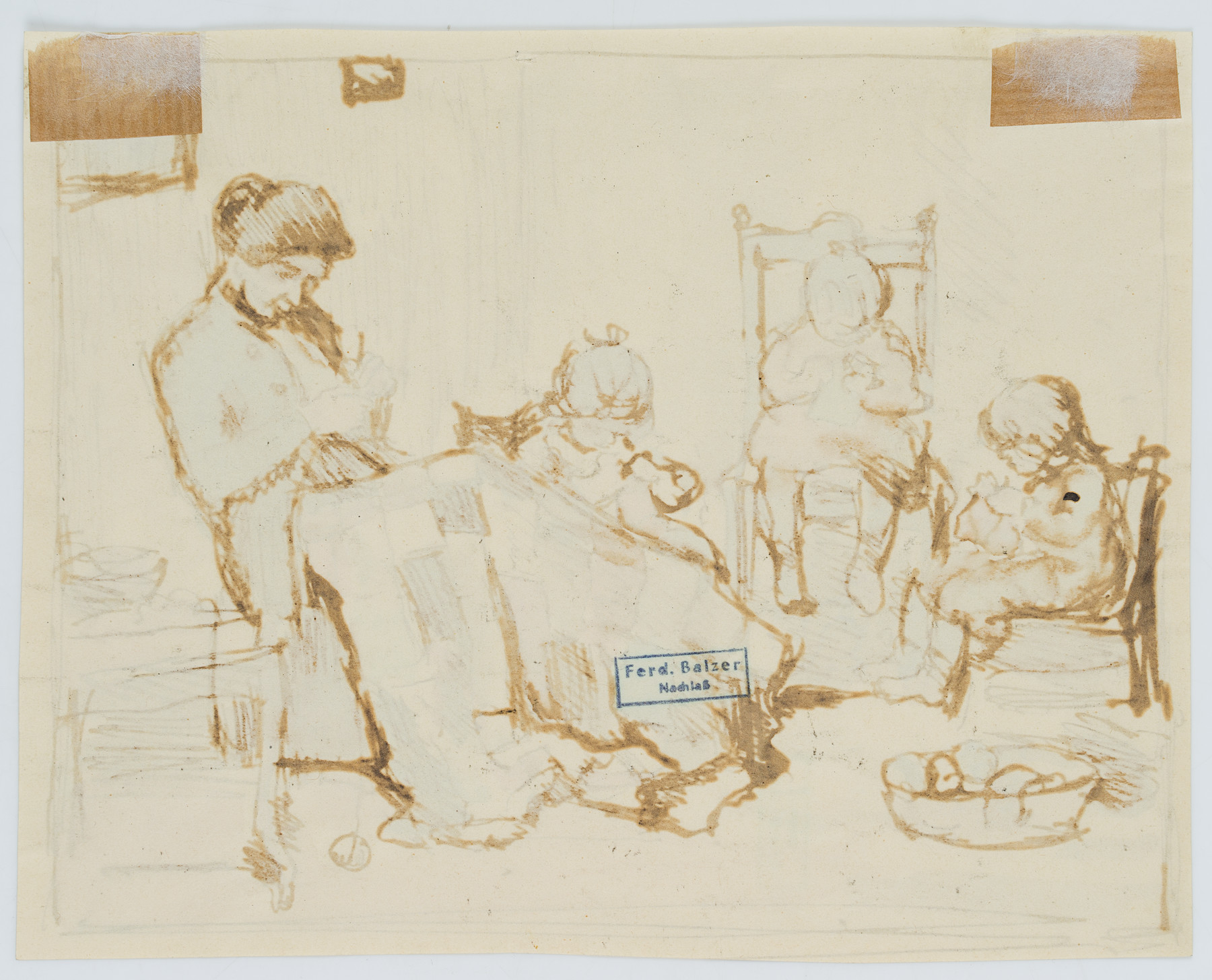 Ferdinand Balzer (1872 Frankfurt on the Main – 1916 ibid.), Mother crocheting with playing children, c. 1900, Pen drawing