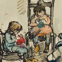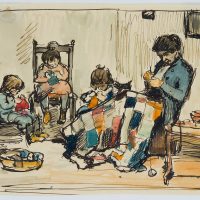 Ferdinand Balzer (1872 Frankfurt am Main – 1916 ebd.), Mutter beim Häkeln mit spielenden Kindern, um 1900, Federzeichnung