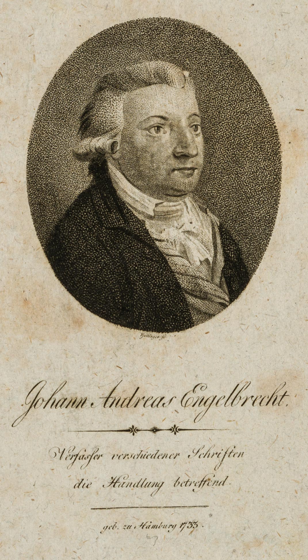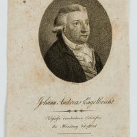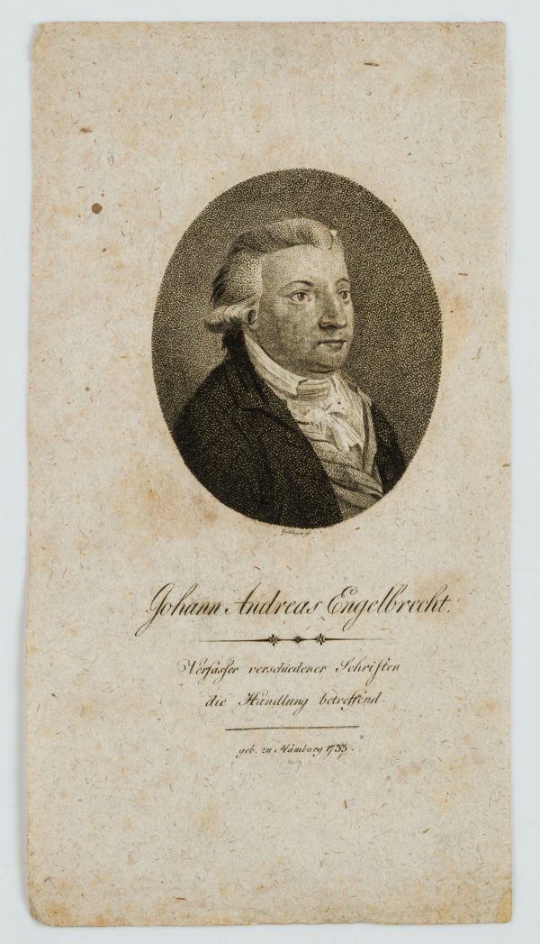 - Description: Johann Andreas Engelbrecht: (1733* Hamburg) Economist, writer and translator. 1756 foreign language correspondent and private scholar in Bremen. Signed “Bollinger sc” in the centre below, inscribed with the sitter’s name and dates of life below.