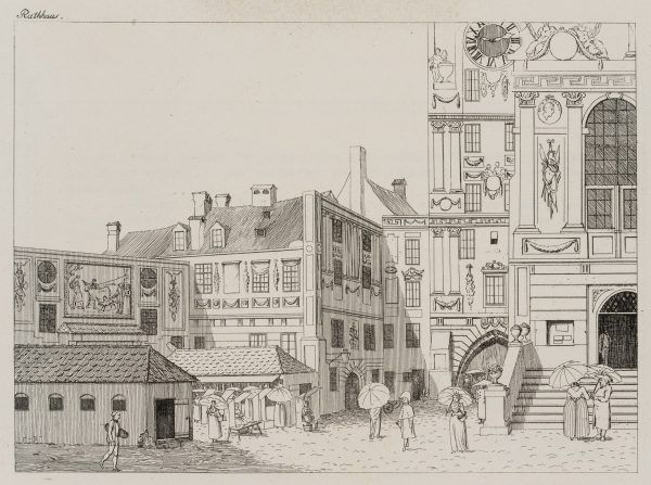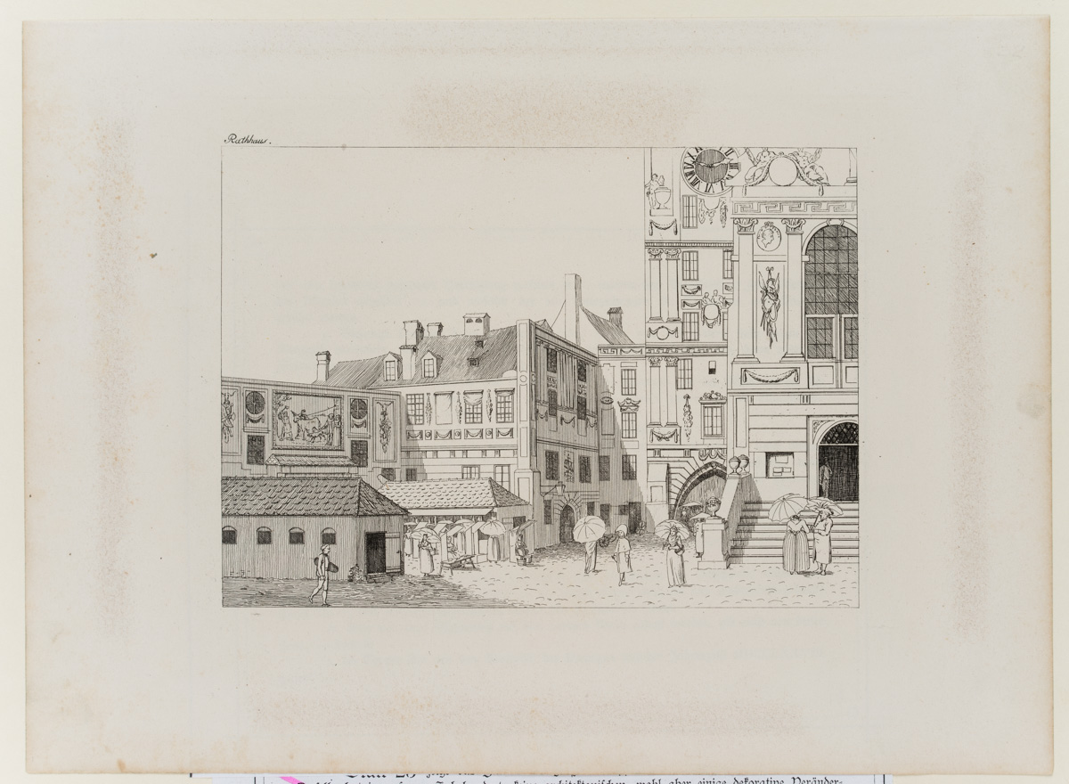 Schöne Ansicht des Alten Rathauses von München mit Figurenstaffage aus Münchner Bürgern.