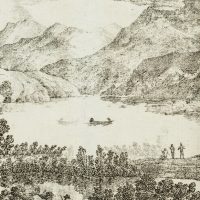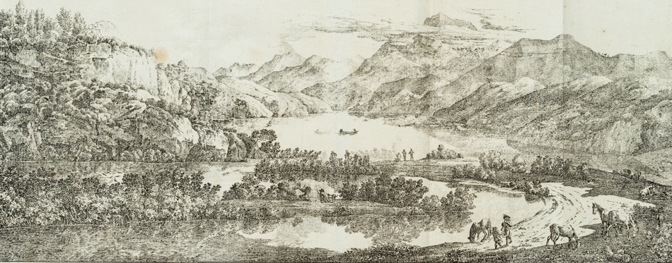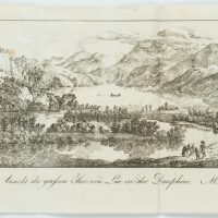- Description: Idyllic landscape with a view over a large lake in the Dauphiné region of southern France. The impressive Dauphiné Alps rise around the mirror-smooth lake. In places, individual figures are shown fishing and hunting. In the foreground some horses are grazing.