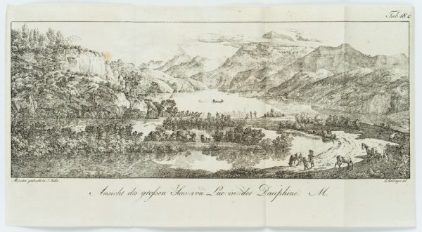 - Bezeichnung: Unterhalb der Darstellung in der Druckplatte vom Künstler signiert und in deutscher Sprache bezeichnet: “Ansicht des Grossen Sees von Luc in der Dauphiné. M.”. Der Druck erfolgte bei Jospeh Sidler in München. Oberhalb befindet sich die Nummerierung “Tab[ula] 18c”.
