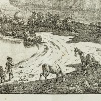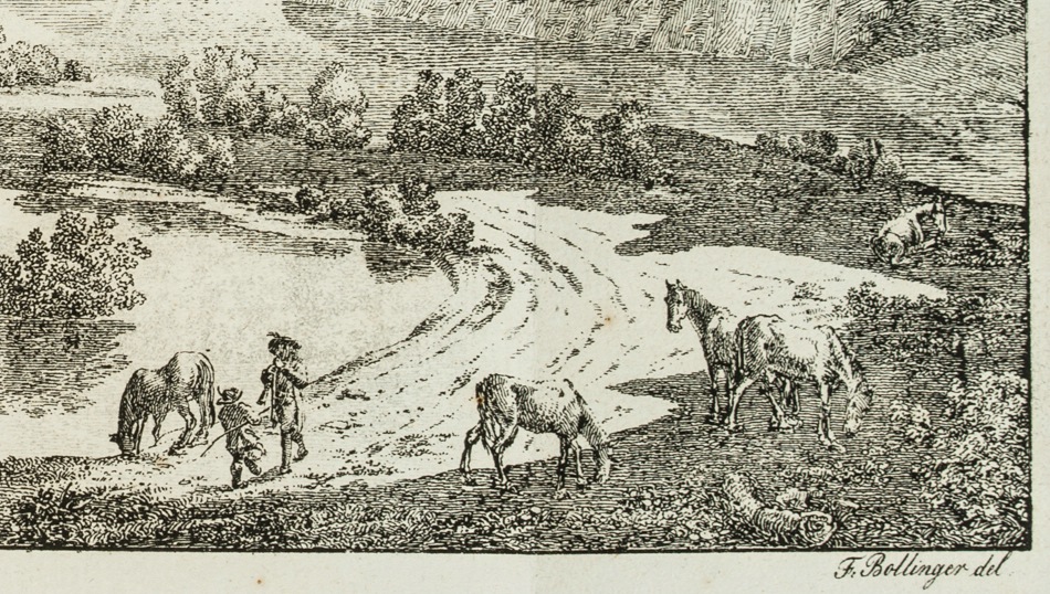 - Beschreibung: Idyllisches Landschaftsbild mit Blick über einen großen See in der südfranzösischen Region Dauphiné. Um den spiegelglatt liegenden See erheben sich die beeindruckenden Dauphiné-Alpen. Stellenweise sind einzelne Figuren beim Angeln und bei der Jagd gezeigt. Im Vordergrund grasen einige Pferde.