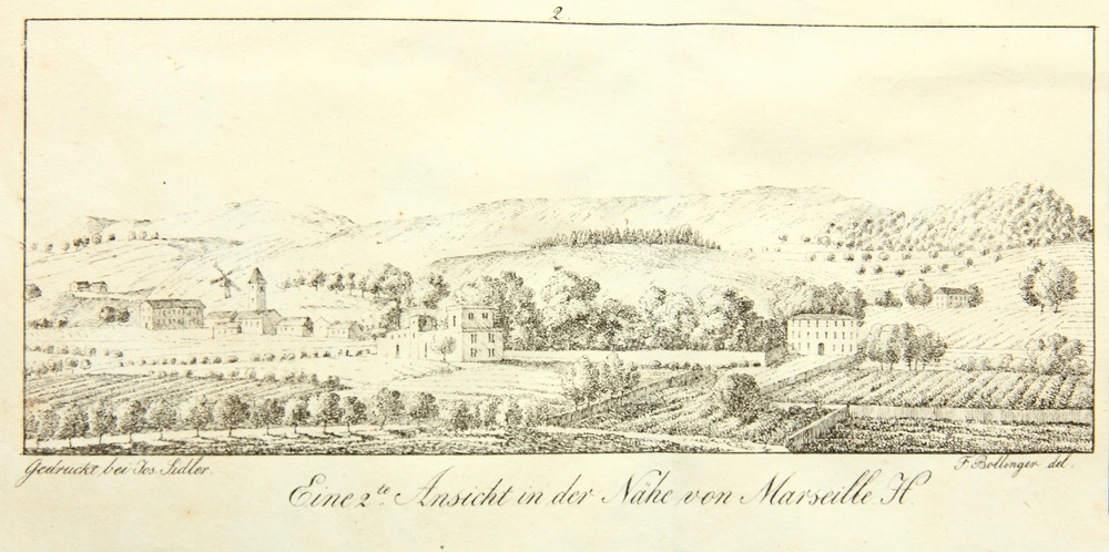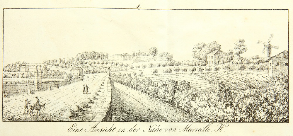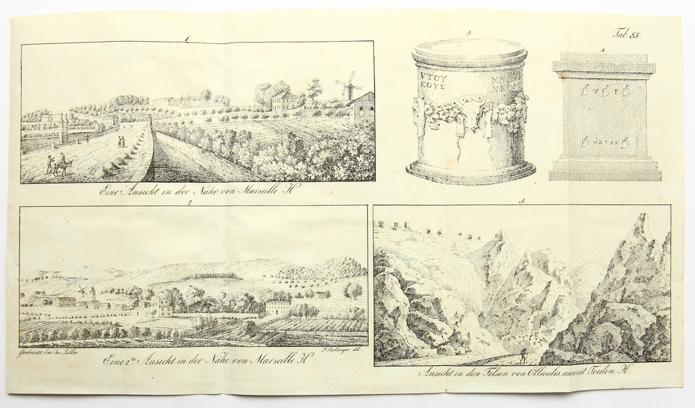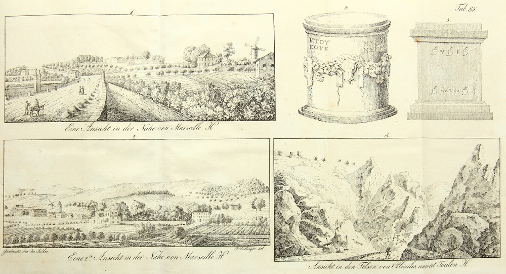 - Beschreibung: Dargestellt sind in zwei einzelnen Abbildungen romantische Landschaftsbilder mit Weingütern und dörflicher Bebauung in der südfranzösischen Region Provence-Alpes-Côte d?Azur bei Marseille. Rechts oben sind zwei antike Monumente, schlichte Grabmäler oder Kultsteine mit griechischer bzw. lateinischer Inschrift dargestellt. Darunter befindet sich eine zerklüftete Felsenlandschaft der “Felsen von Ollioules unweit Toulon” mit einem einsamen Wanderer. Die einzelnen Darstellungen sind jeweils unterhalb in der Druckplatte in deutscher Sprache bezeichnet und oberhalb von 1 bis 5 nummeriert. Oben rechts befindet sich die Nummerierung des Blattes “Tab[ula] 85”.