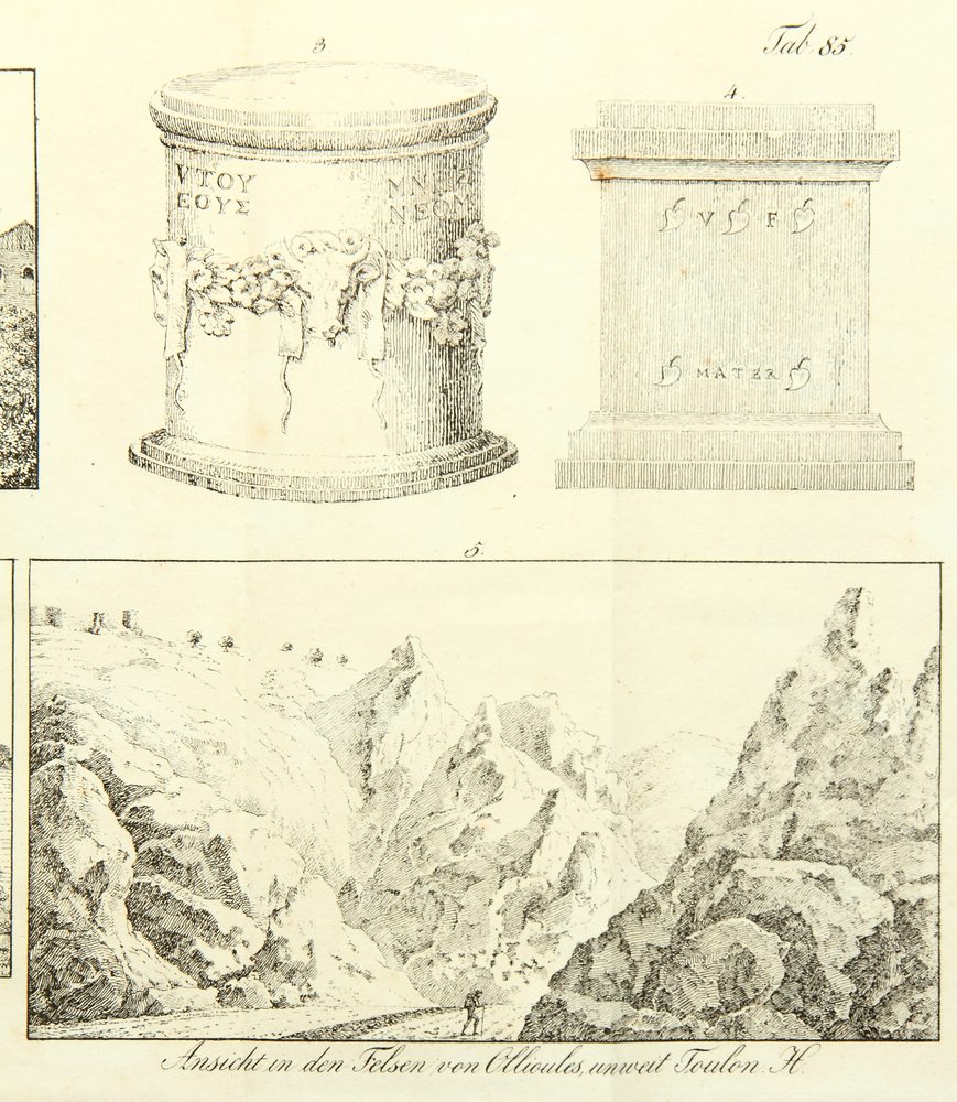 - Description: Depicted in two individual images are romantic landscapes with vineyards and village buildings in the southern French region of Provence-Alpes-Côte d’Azur near Marseille. At the top right are two ancient monuments, simple tombs or cult stones with Greek and Latin inscriptions, respectively. Below is a rugged rocky landscape of the “Rocks of Ollioules not far from Toulon” with a lonely hiker. The individual depictions are each inscribed in German below in the printing plate and numbered from 1 to 5 above. At the top right is the numbering of the sheet “Tab[ula] 85”.