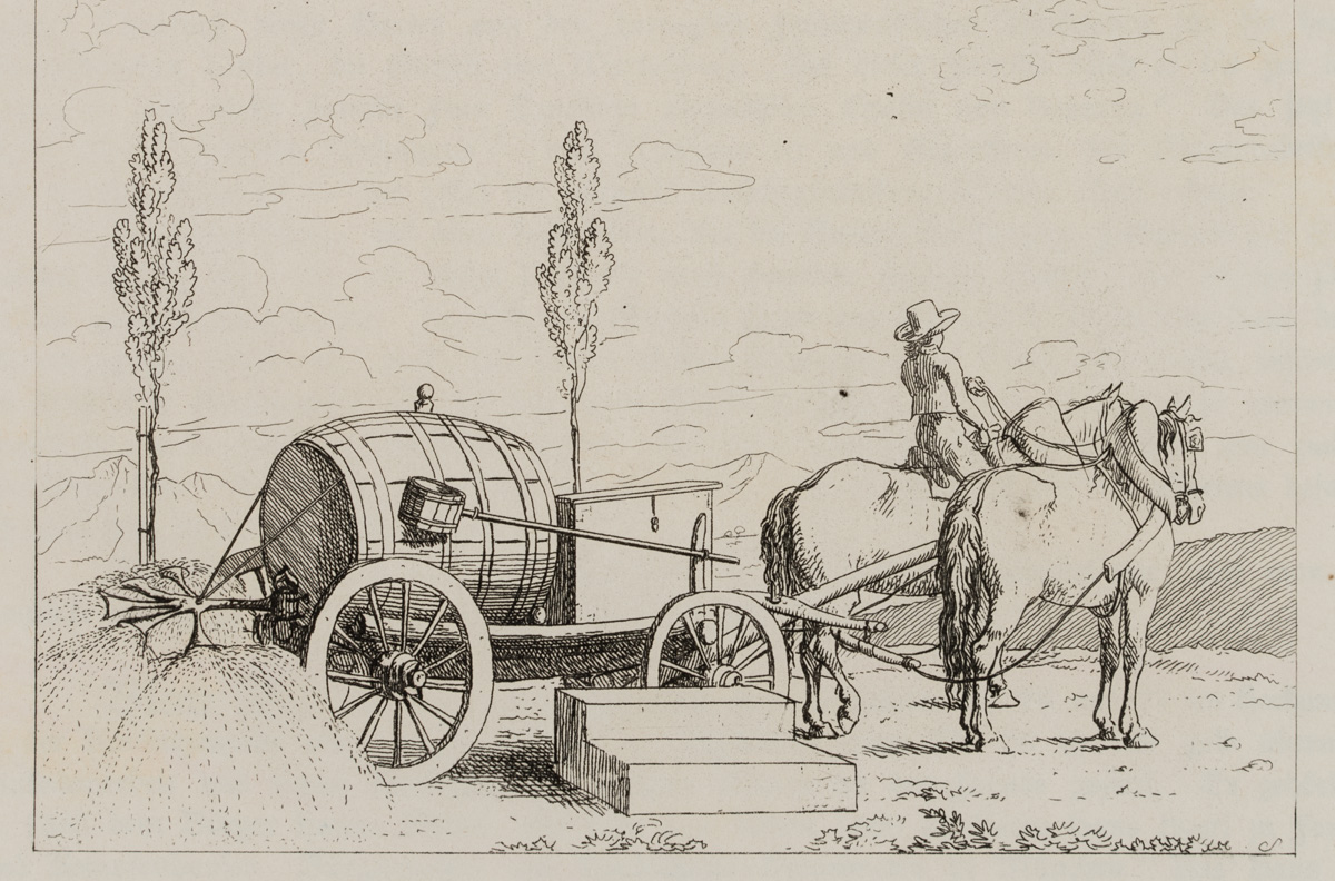 - Beschreibung: Schöne Straßenansicht einer Häuserzeile in der Münchner Altstadt. Unten ist ein Bauer aus der Umgebung Münchens gezeigt, der mit einem Güllefass über den Acker fährt.