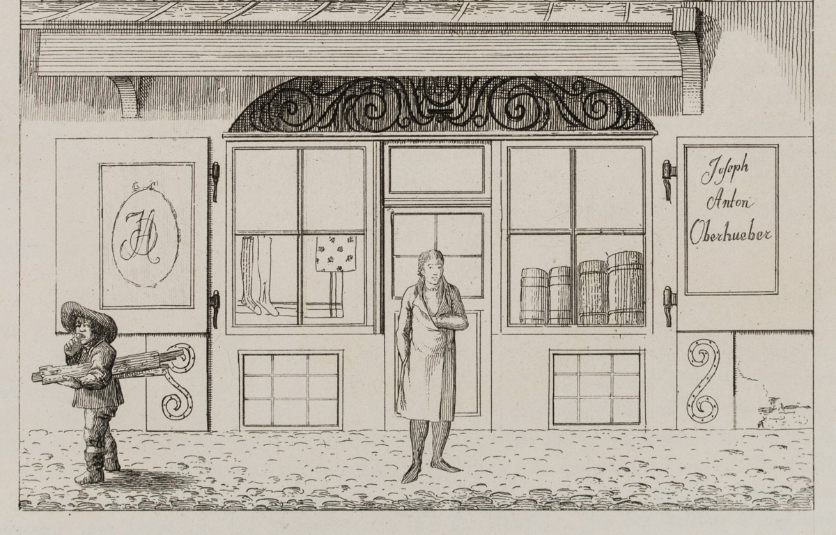 - Beschreibung: Schöne Straßenansicht in der Münchner Altstadt. Unten ist ein Kaufmann vor seinem Geschäft zu sehen.