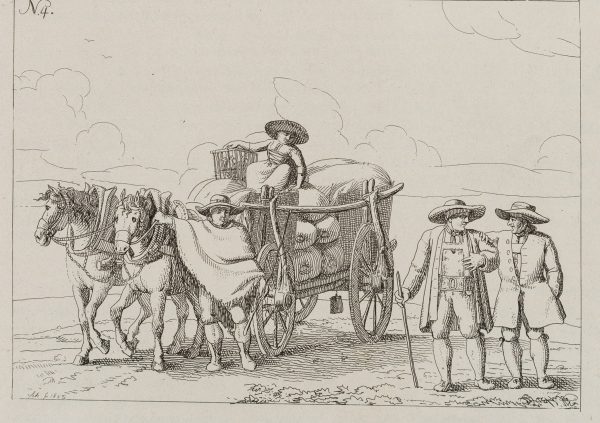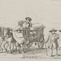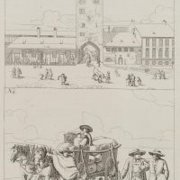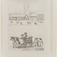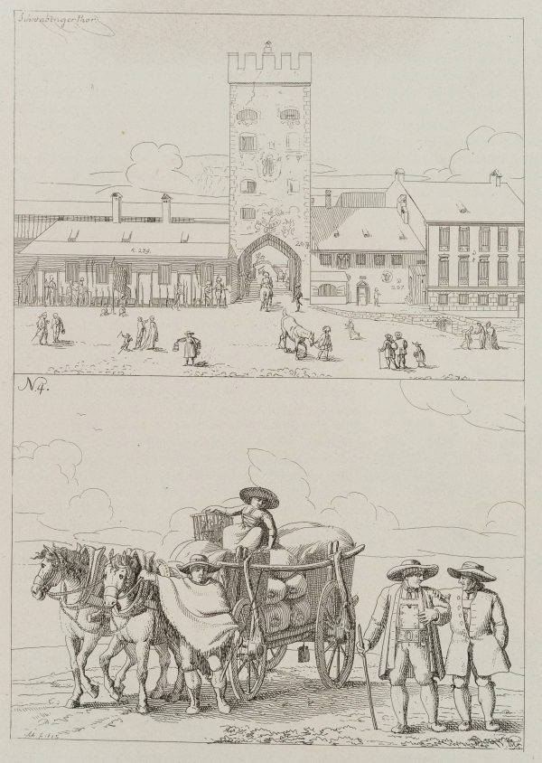 - Description: View of the city side of the Schwabinger Tor in Munich with a busy forecourt and guards at their quarters. A grain cart with farmer and carter is depicted below.