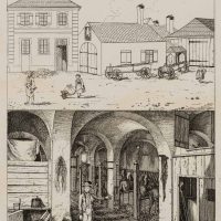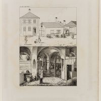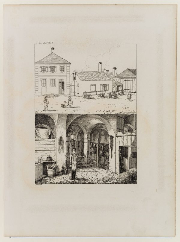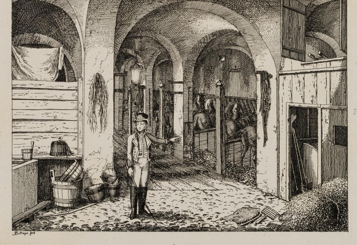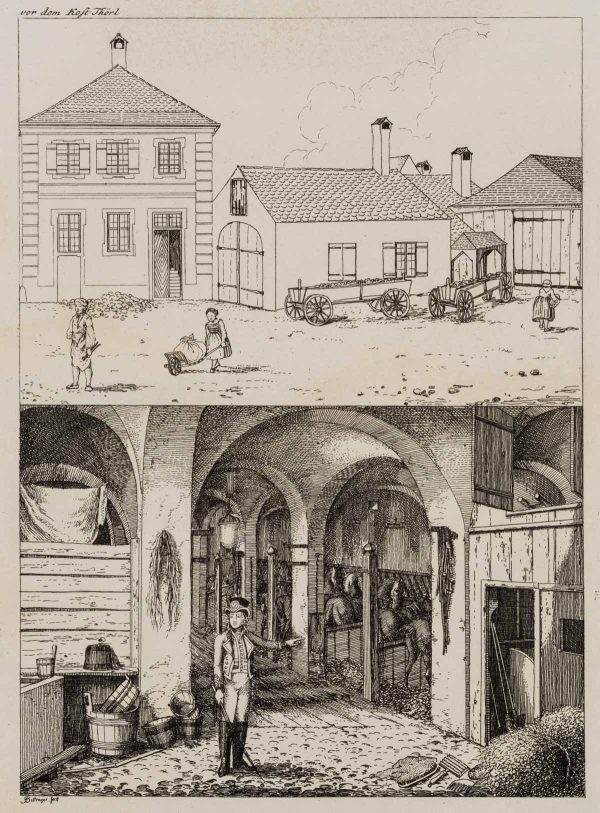 - Description: Beautiful view of the Hatschierstall in the Graggenauerviertel with blacksmith and maids. Below is an electoral postillon in a vaulted horse stable.