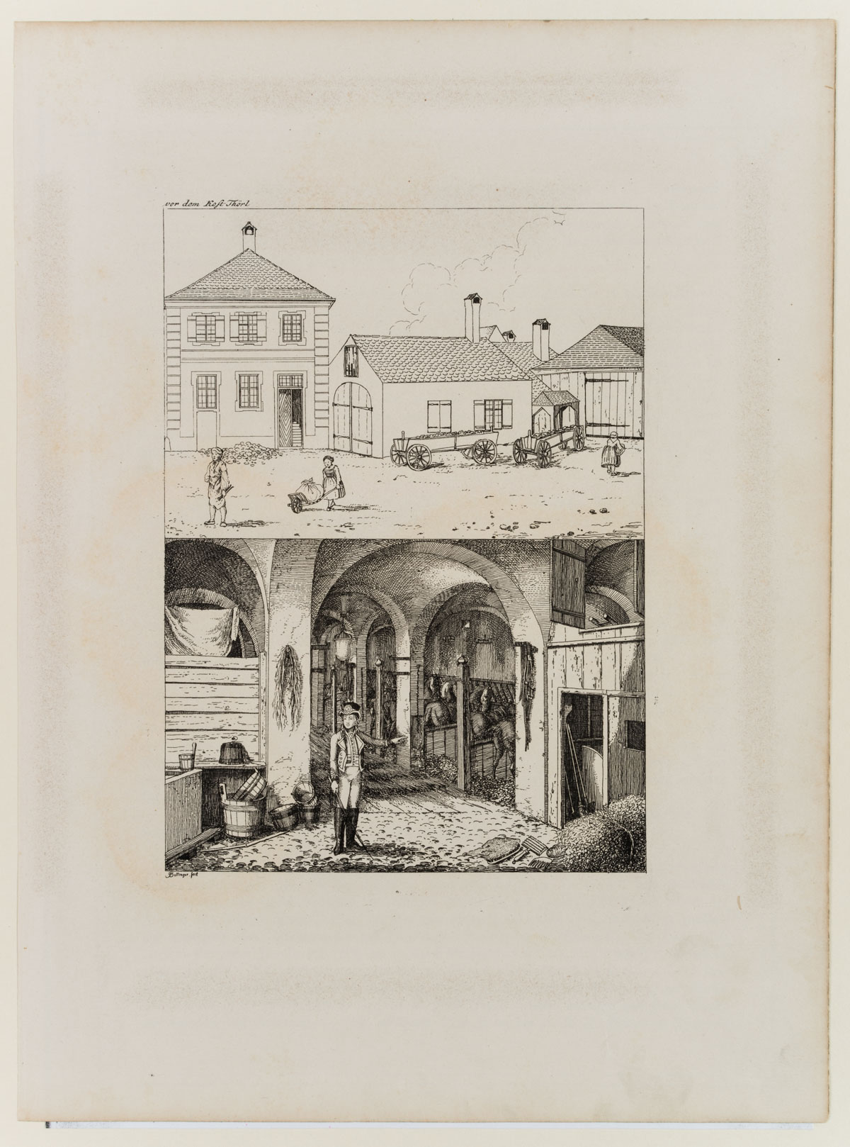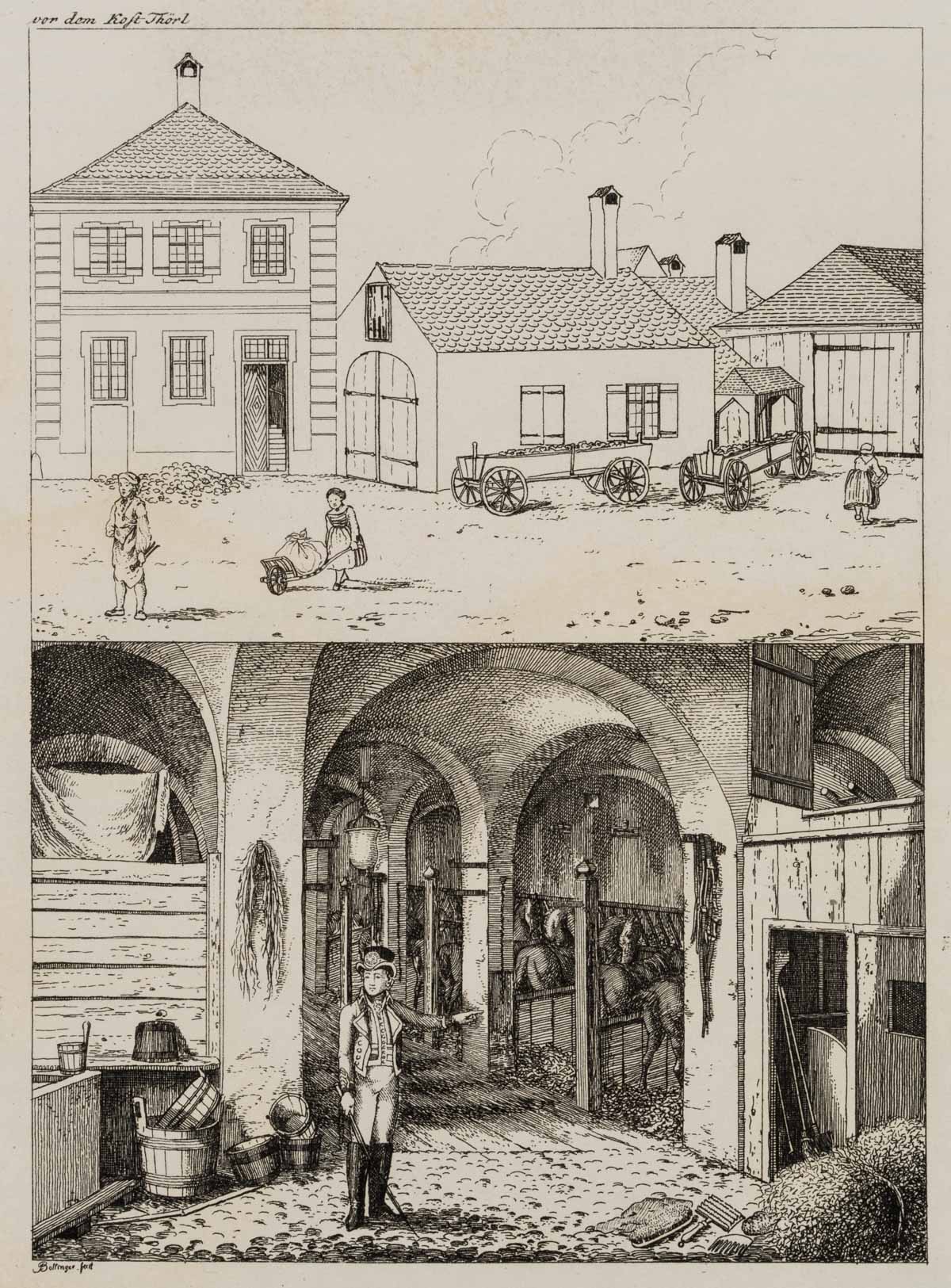 - Beschreibung: Schöne Ansicht des Hatschierstalles im Graggenauerviertel mit Hufschmied und Mägden. Unten ist ein kurfürstlicher Postillon in einem gewölbten Pferdestall zu sehen.