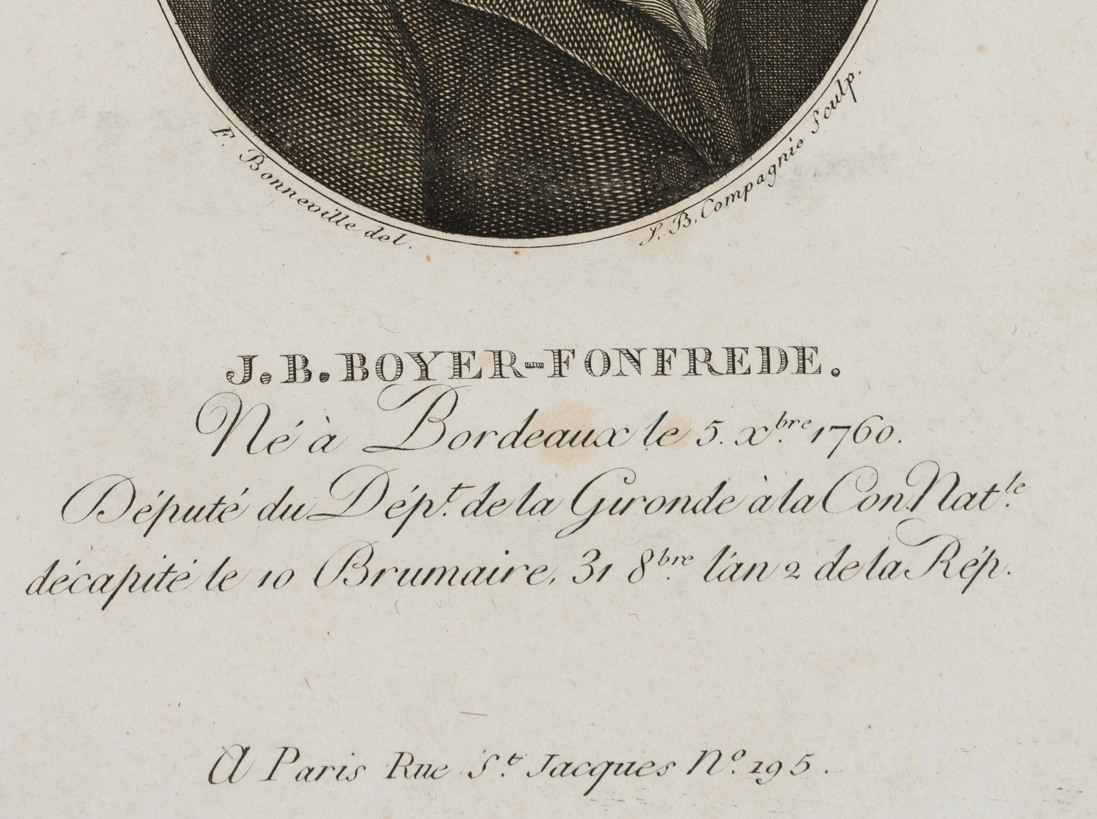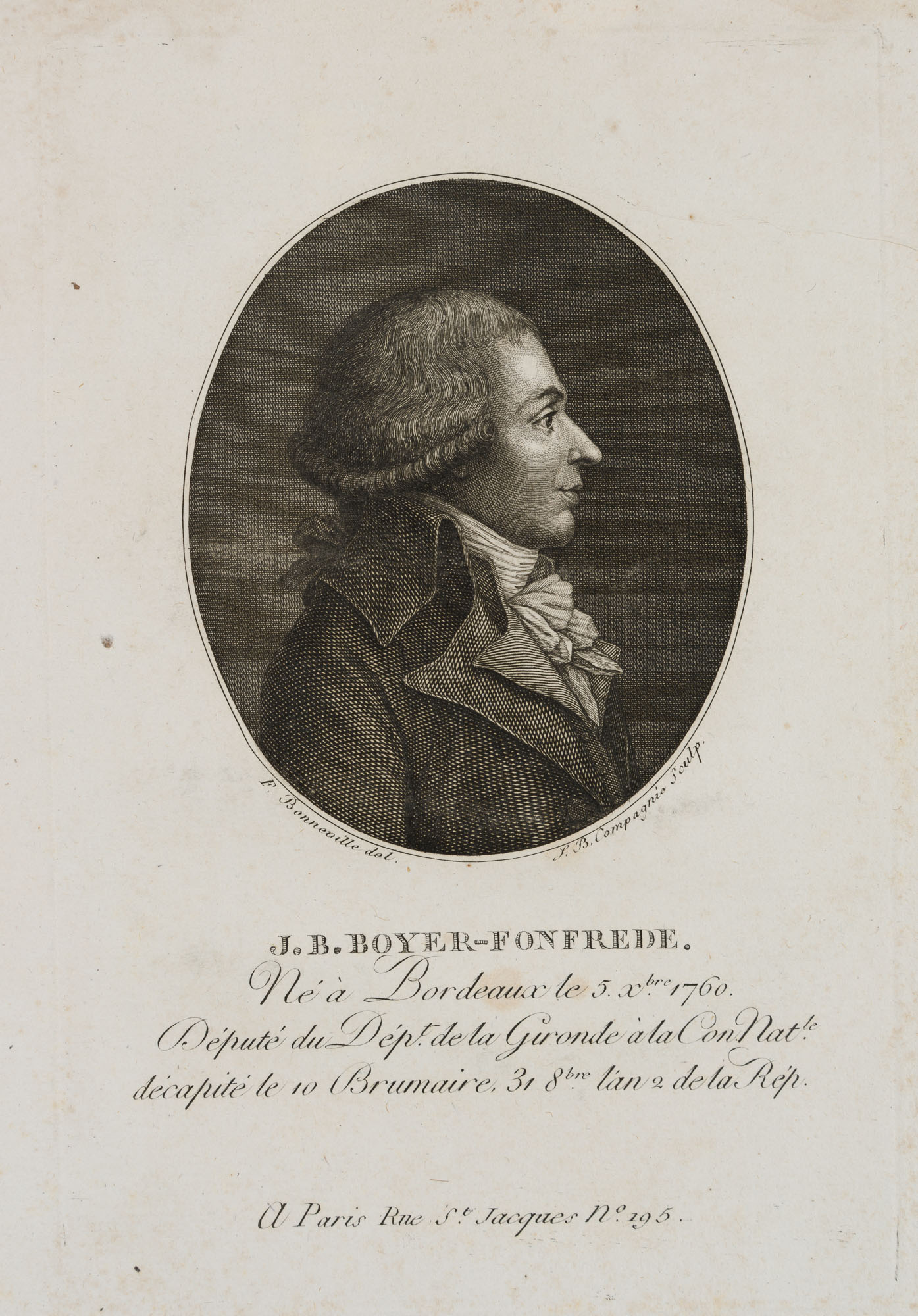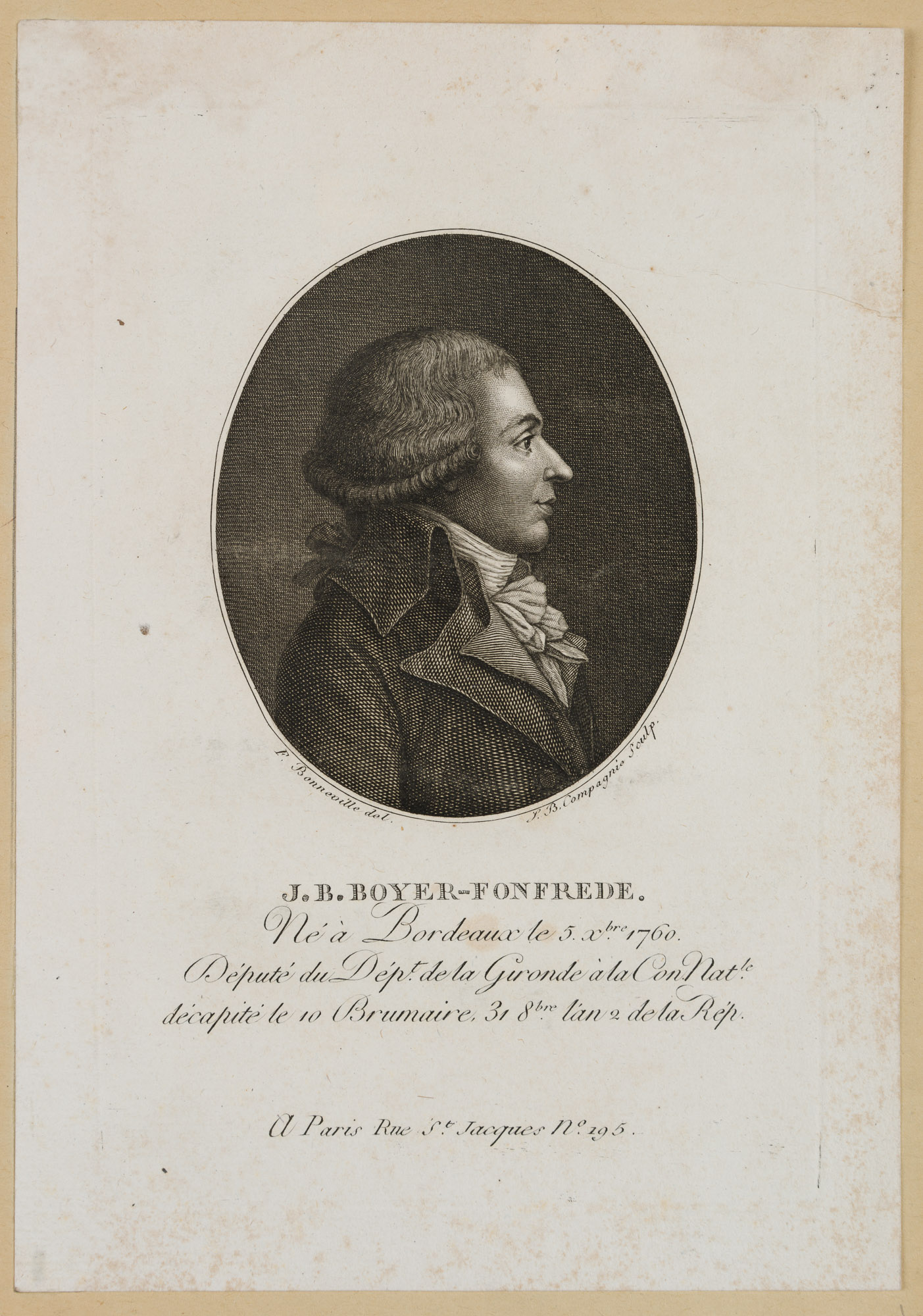 - Description: Engraving by F. Bonneville, with text page printed on both sides from Bonneville’s “Portr. des personnages célèbres de la Révolution”, signed and inscribed: “F. Bonneville del. S. B. Compagnie sculp. J. B. Boyer-Fonfrede. Né à Bordeaux le 5. xbre 1760. Député du dépt. de la Gironde à la Con Nat. décapité le 10 Brumaire 31 8bre lán 2 de la Rép. A Paris Rue St. Jacques N° 195.” Very fine portrait of J. B. Boyer-Fonfrede in half profile with black skirt and white neckerchief. François Bonneville (first mention 1796, last mention 1802) was a portrait painter, engraver, etcher and publisher. Bonneville became known for his four-volume work “Portr. des personnages célèbres de la Révolution” with annotations by P. Quenard. The work contains 200 portraits (copper engravings and etchings) after his own drawings, some of which he engraved himself. Portr. des personnages célèbres de la Révolution is of great contemporary historical importance, as it contains the only authentic portraits of many personalities of the revolutionary period. Jean-Baptiste Boyer-Fonfrède (1766, Bordeaux – 1793) belonged to the Girondists and supported the execution of Louis XVI.