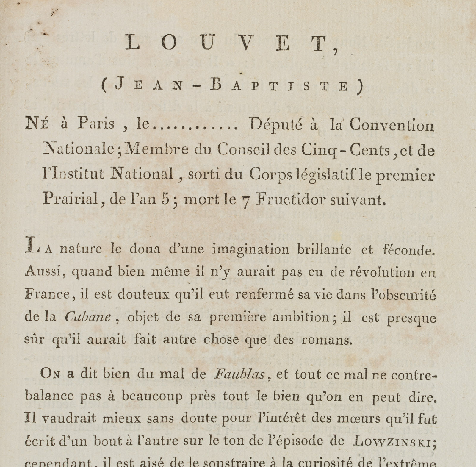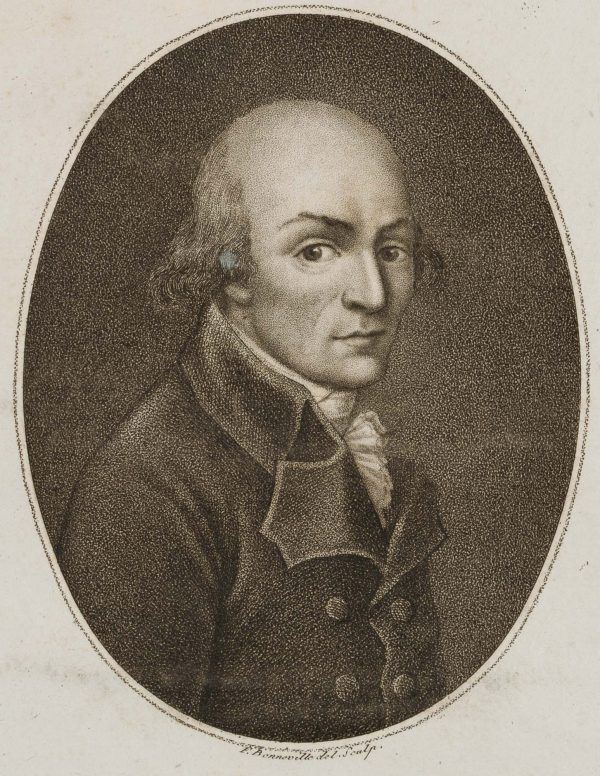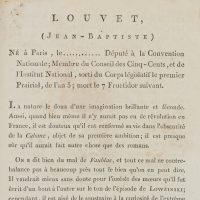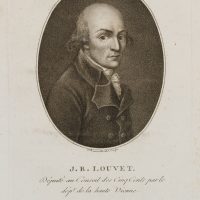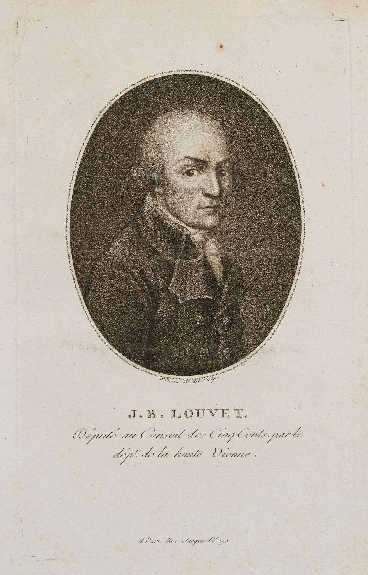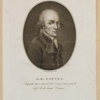 - Description: Etching by F. Bonneville, with text from Bonneville’s “Portr. des personnages célèbres de la Révolution”, signed below the image: “F. Bonneville del. et sculp.”, inscribed below “J. B. Louvet. Député au Conseil des Cinq Cents parle dep. de la haute Vienne”. Bonneville portrayed Louvet in half profile. Only a few long hairs crown Louvet’s bald skull. With his very large eyes and small mouth, he appears reserved, looking earnestly at the viewer. Jean-Baptiste Louvet, called Louvet de Couvray (1760 – 1797), was a politician during the French Revolution. As a writer he had become famous in France with the novels “The Adventures of Chevalier Faublas” (1787/1789) and “Emilie de Varmont” (1791). François Bonneville (first mention 1796, last mention 1802) was a portrait painter, engraver, etcher and publisher. Bonneville became known for his four-volume work “Portr. des personnages célèbres de la Révolution” with annotations by P. Quenard. The work contains 200 portraits (copper engravings and etchings) after his own drawings, some of which he engraved himself. “Portr. des personnages célèbres de la Révolution” is of great contemporary historical importance, as it contains the only authentic portraits of many personalities of the revolutionary period.