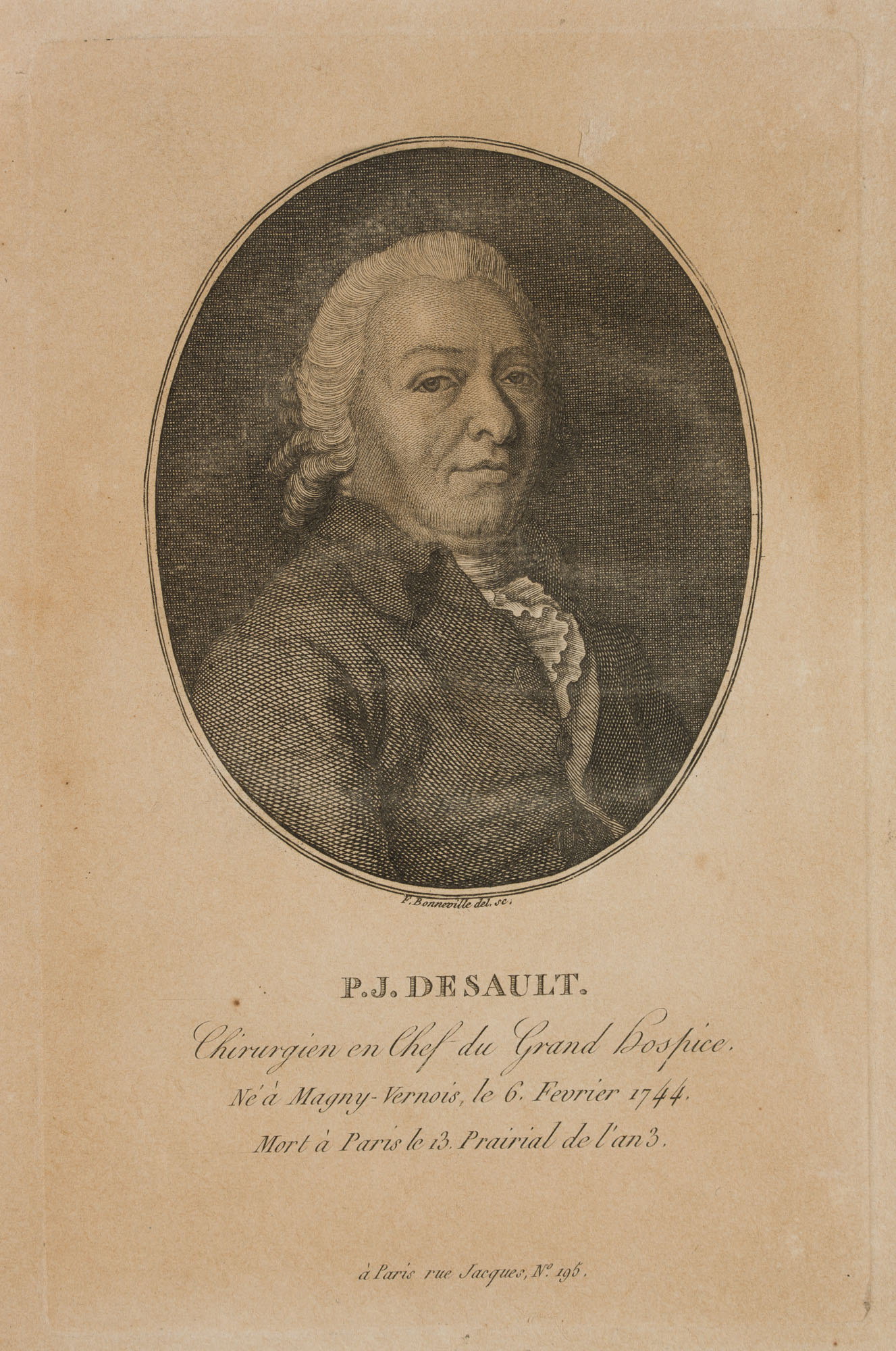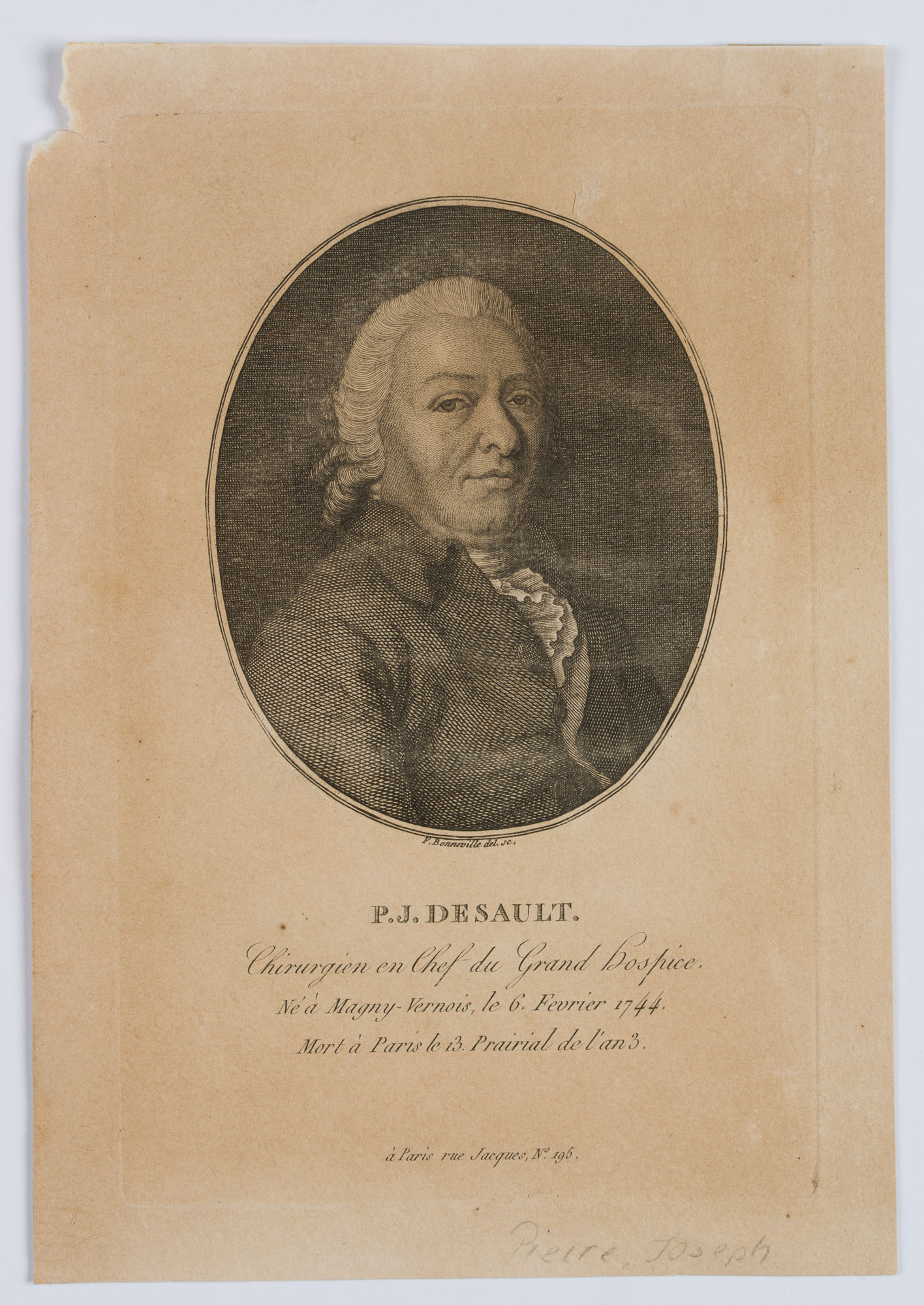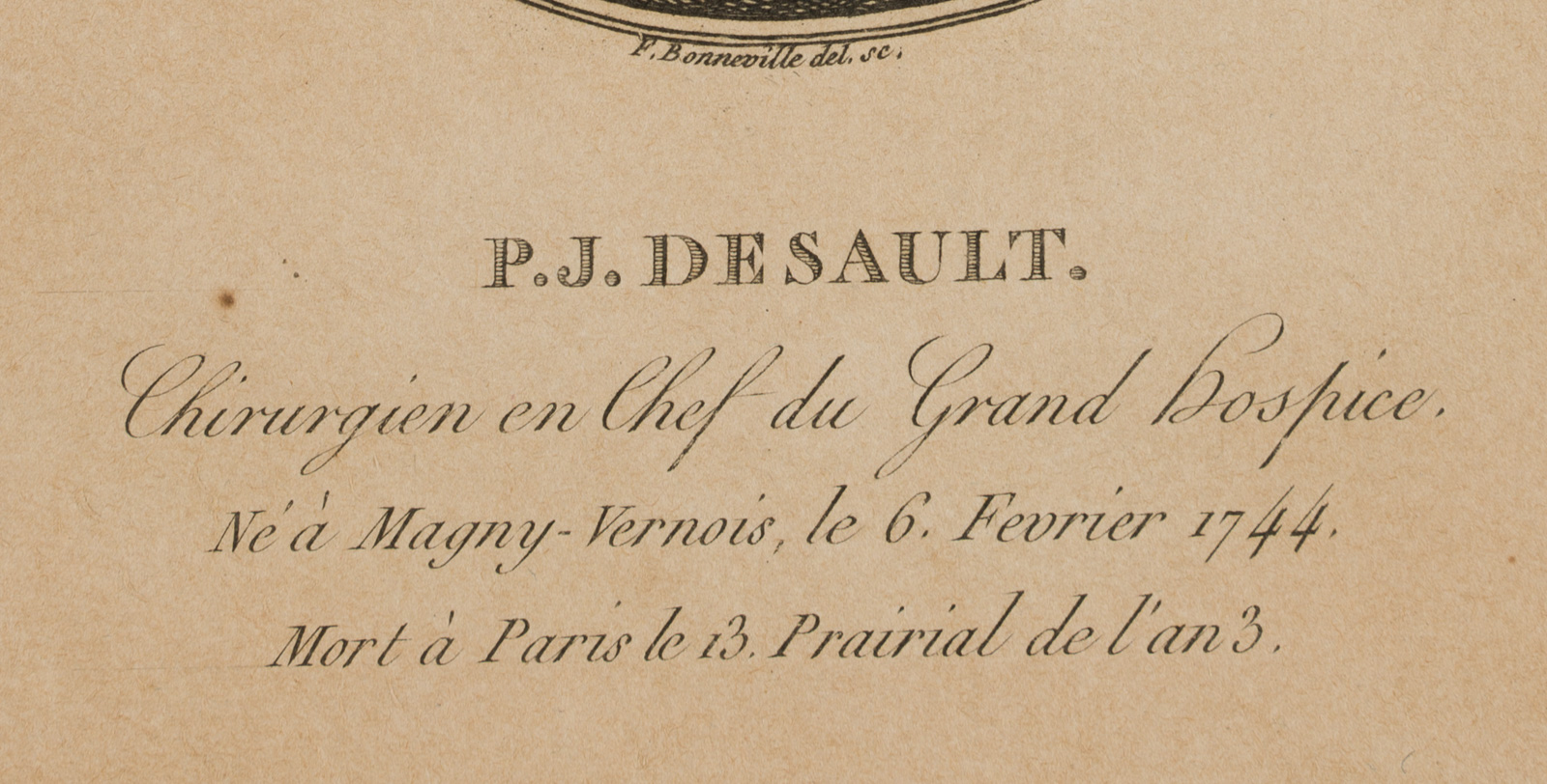 - Description: Engraving by F. Bonneville, with text from Bonneville’s “Portr. des personnages célèbres de la Révolution”, signed and inscribed below the image: “F. Bonneville del. sc./ P. J. DESAULT. Surgeon en Chef du Grand Hospice. Né à Magny-Vernois, le 6. Fevrier 1744. Mort à Paris le 13. Prairial de l`an 3.” Bonneville captures Desault in half profile. A large nose and full lips dominate the coarse features of P. J. Desault. The shades of the facial features are worked out with very fine lines. The white wig sets the face off even more clearly from the dark background and gives the print depth. Pierre-Joseph Desault (1744 – 1795) was a surgeon known throughout Europe. In 1795 he became professor at the Ècole de Santé. He introduced numerous innovations, brought precision and method to the study of surgery. The so-called “Desault bandage”, a shoulder bandage used for collarbone fractures, is named after him. François Bonneville (first mentioned in 1796, last mentioned in 1802) was a portrait painter, engraver, etcher and publisher. Bonneville became known for his four-volume work “Portr. des personnages célèbres de la Révolution” with annotations by P. Quenard. The work contains 200 portraits (copper engravings and etchings) after his own drawings, some of which he engraved himself. Portr. des personnages célèbres de la Révolution is of great contemporary historical importance, as it contains the only authentic portraits of many personalities of the revolutionary period.