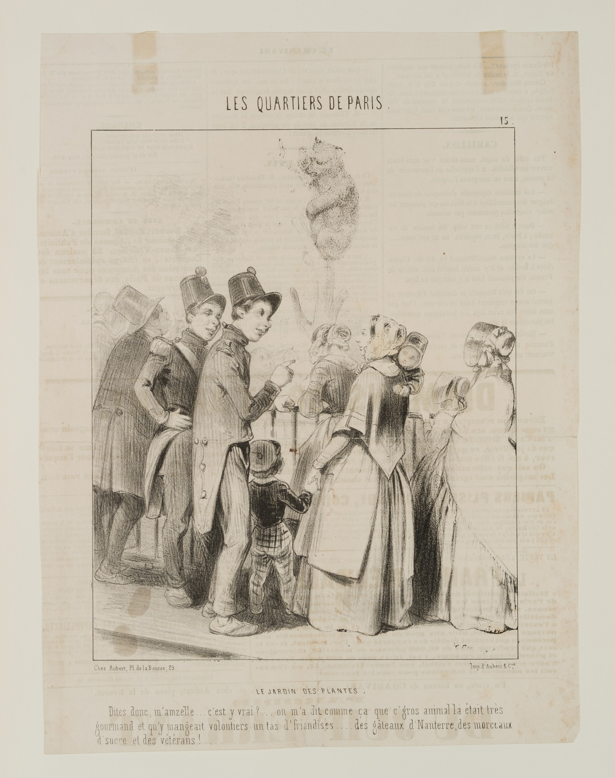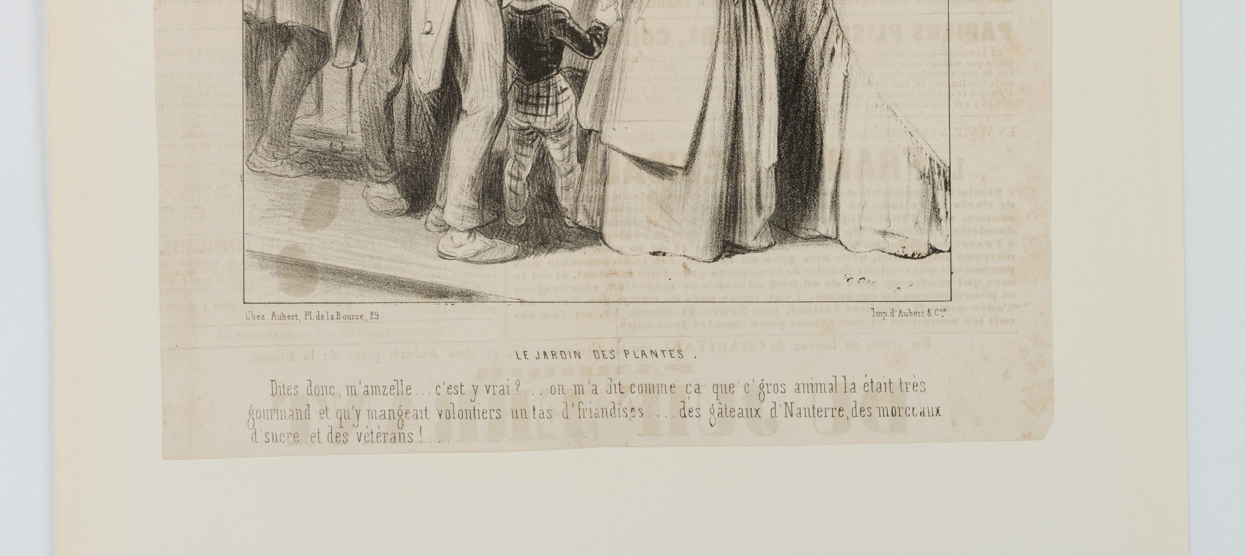 Bildunterschrift. Aus dem Französischen übersetzt: “LE JARDIN DES PLANTES. Sag mal, Mamselle… ist das wirklich so? …man hat mir gesagt, dass dieses große Tier ein Feinschmecker ist und gerne viele Leckereien isst…Kuchen aus Nanterre, Süßigkeiten aus Zucker und Veteranen!… - Verso: Typographischer Druck. Werbeanzeigen