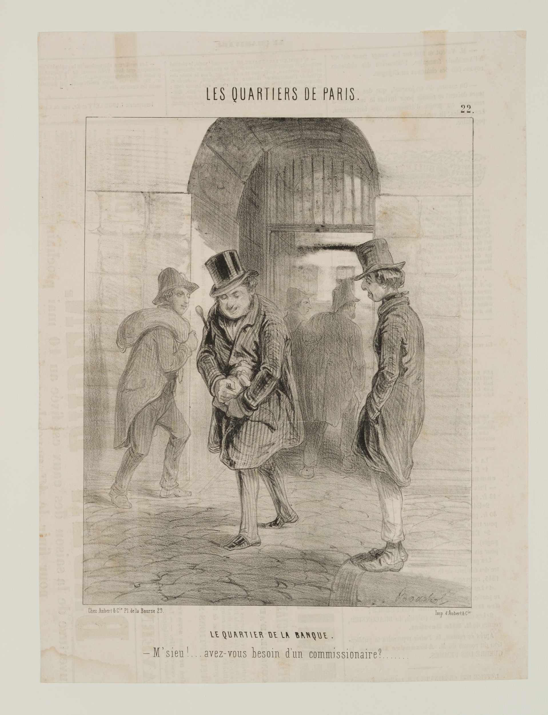 Caption. Translated from the French: “LE QUARTIER DE LA BANQUE. Monsieur! … do you need a commission agent?” - Verso: Typographic printing, advertisements