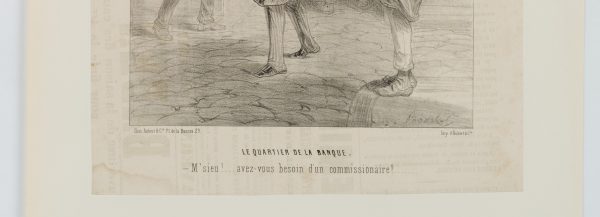 Bildunterschrift. Aus dem Französischen übersetzt: “LE QUARTIER DE LA BANQUE. Monsieur! … brauchen Sie einen Kommissionär?” - Verso: Typographischer Druck, Werbeanzeigen