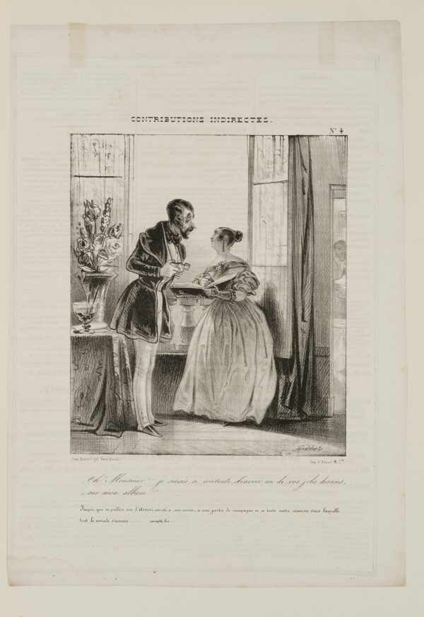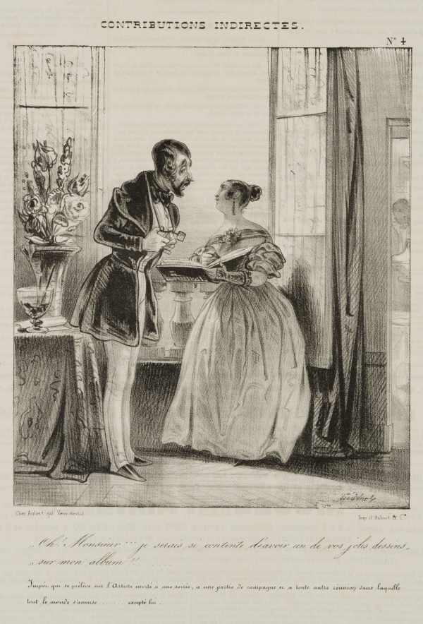 Caption. Translated from the French: “Oh, Monsieur…. I would be so happy to have one of your beautiful drawings. In my album!!!