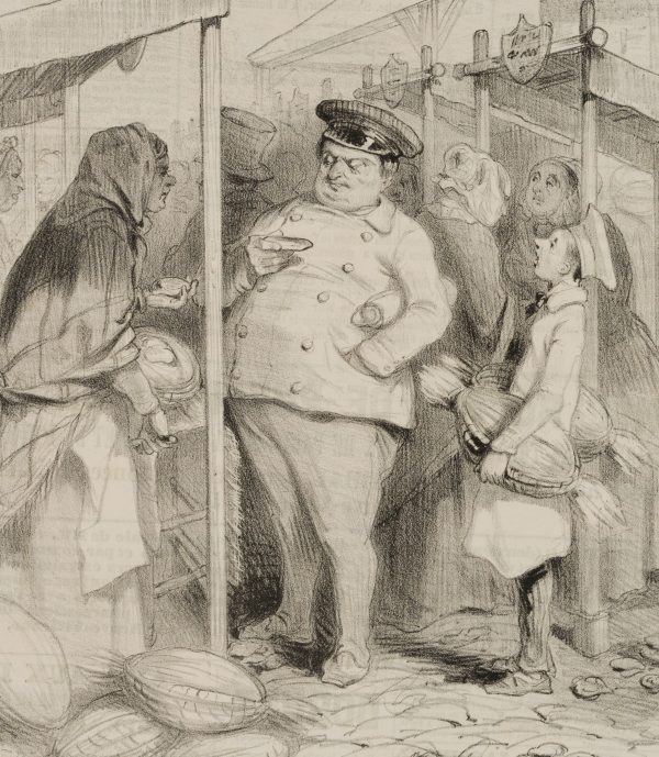 Frédéric Bouchot (1798 – 1860 ), Karikatur. Marktstand mit Austern, , Lithographie