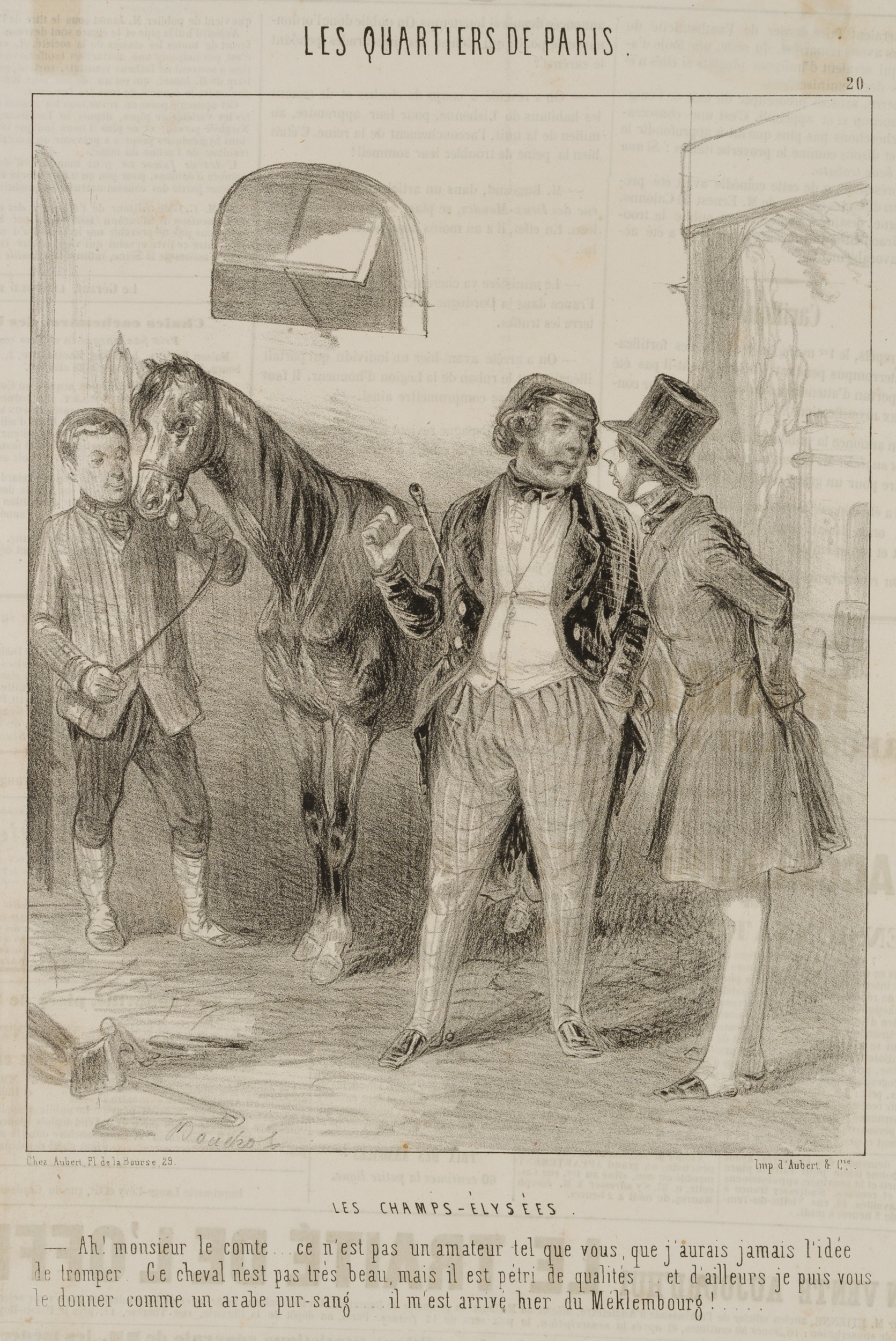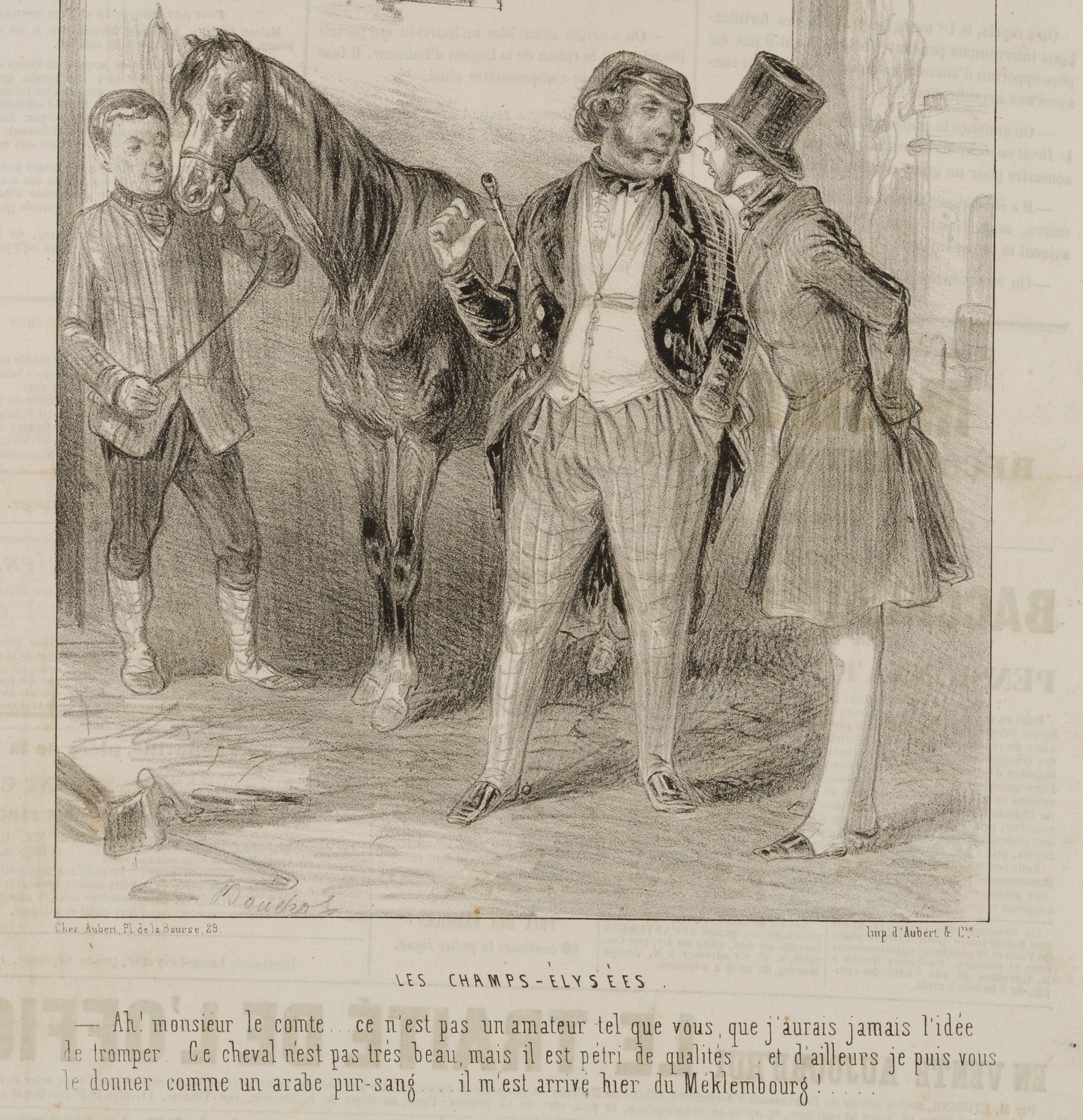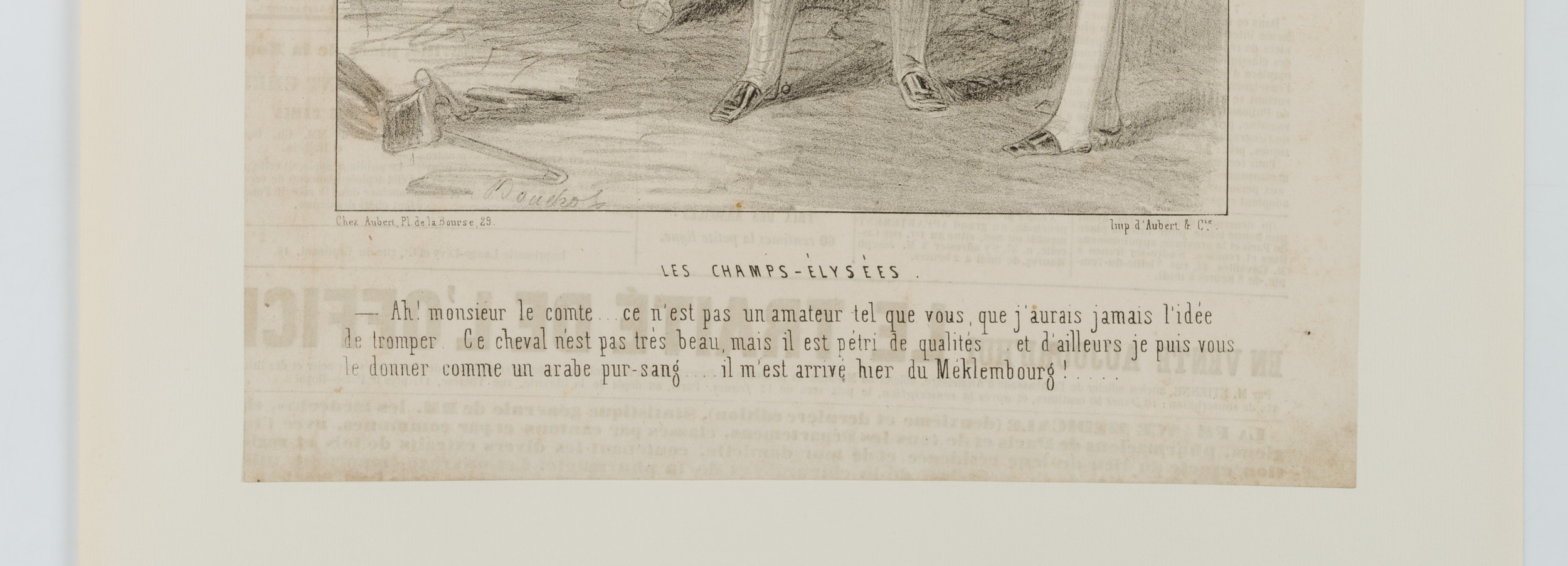 Caption. Translated from the French: “LES CHAMPS ELYSÈES. – Ah! Count, I would never deceive a lover like you. This horse is not very beautiful, but it is studded with qualities…. and besides, I can give it to you as a thoroughbred Arabian…. it came from Mecklenburg yesterday! - Verso: Typographic printing, advertisements