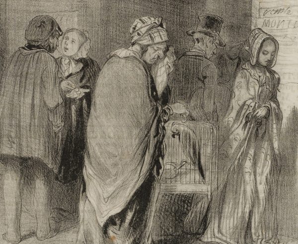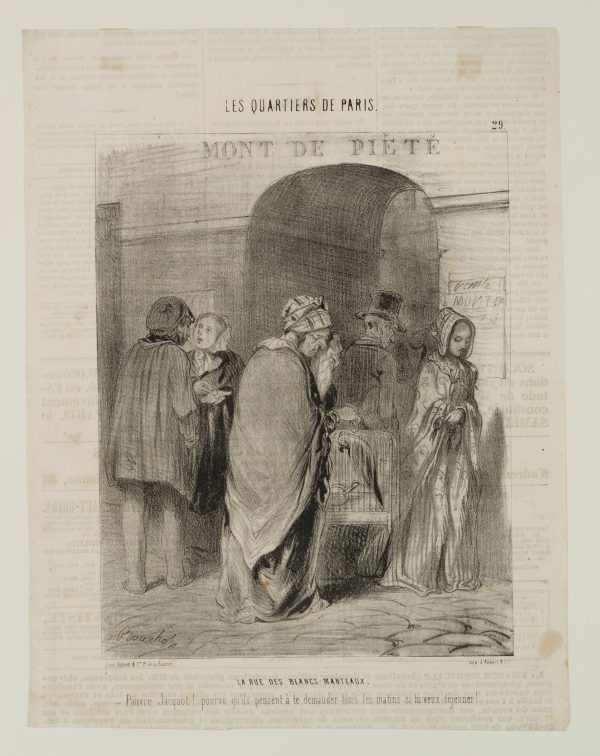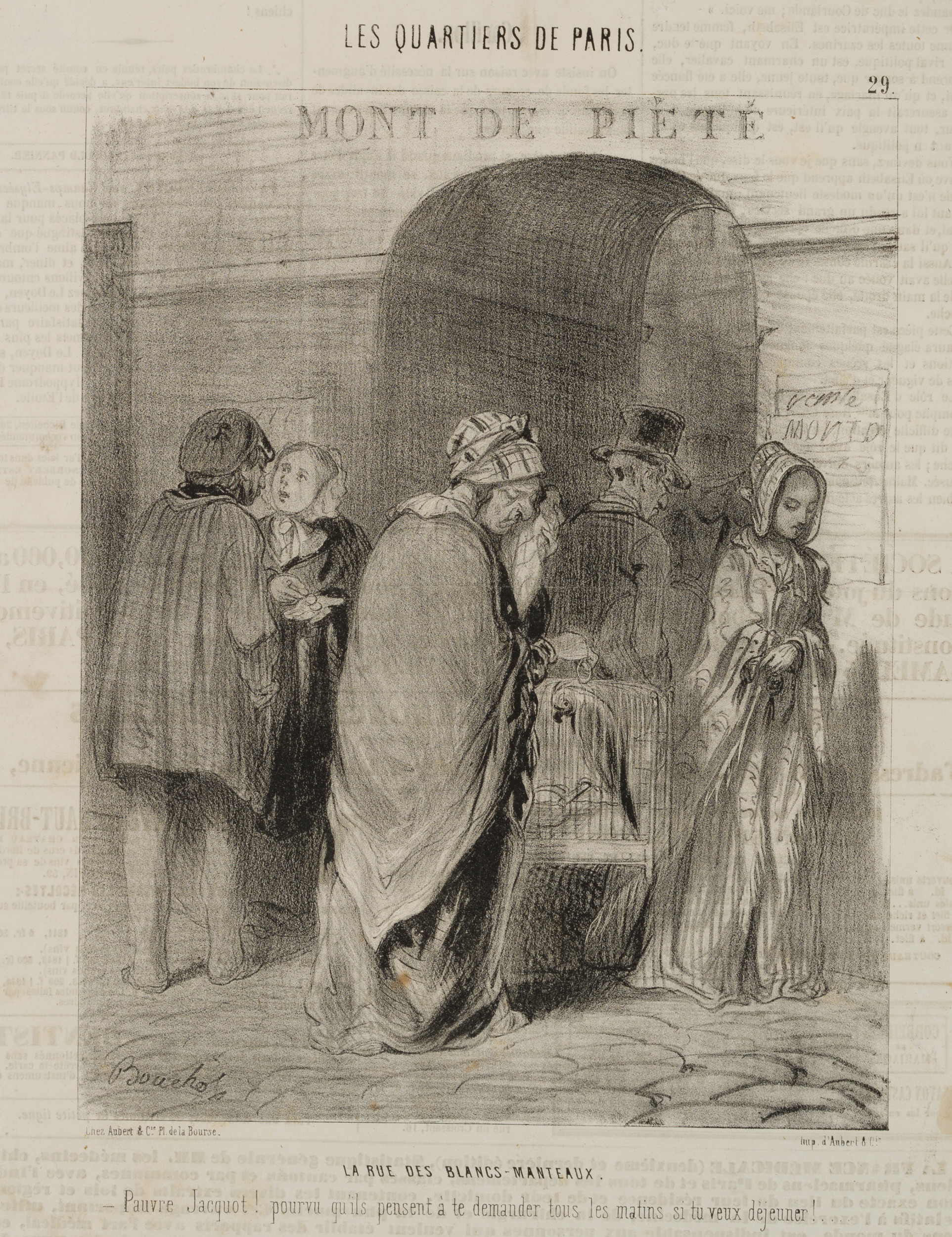 Frédéric Bouchot (1798 – 1860 ), Karikatur. Vor dem Pfandhaus mit Kakadu, , Lithographie