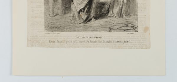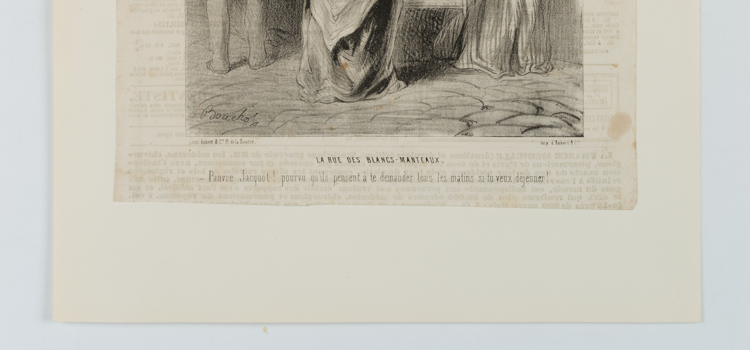 Caption. Translated from the French: ” LA RUE DES BLANCS-MANTEAUX. – Poor cockatoo! Only provided they remember to ask you every day in the morning when you want to have lunch. - Verso: Typographic printing, advertisements