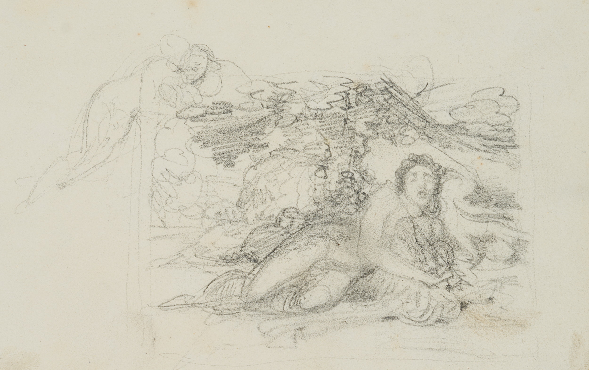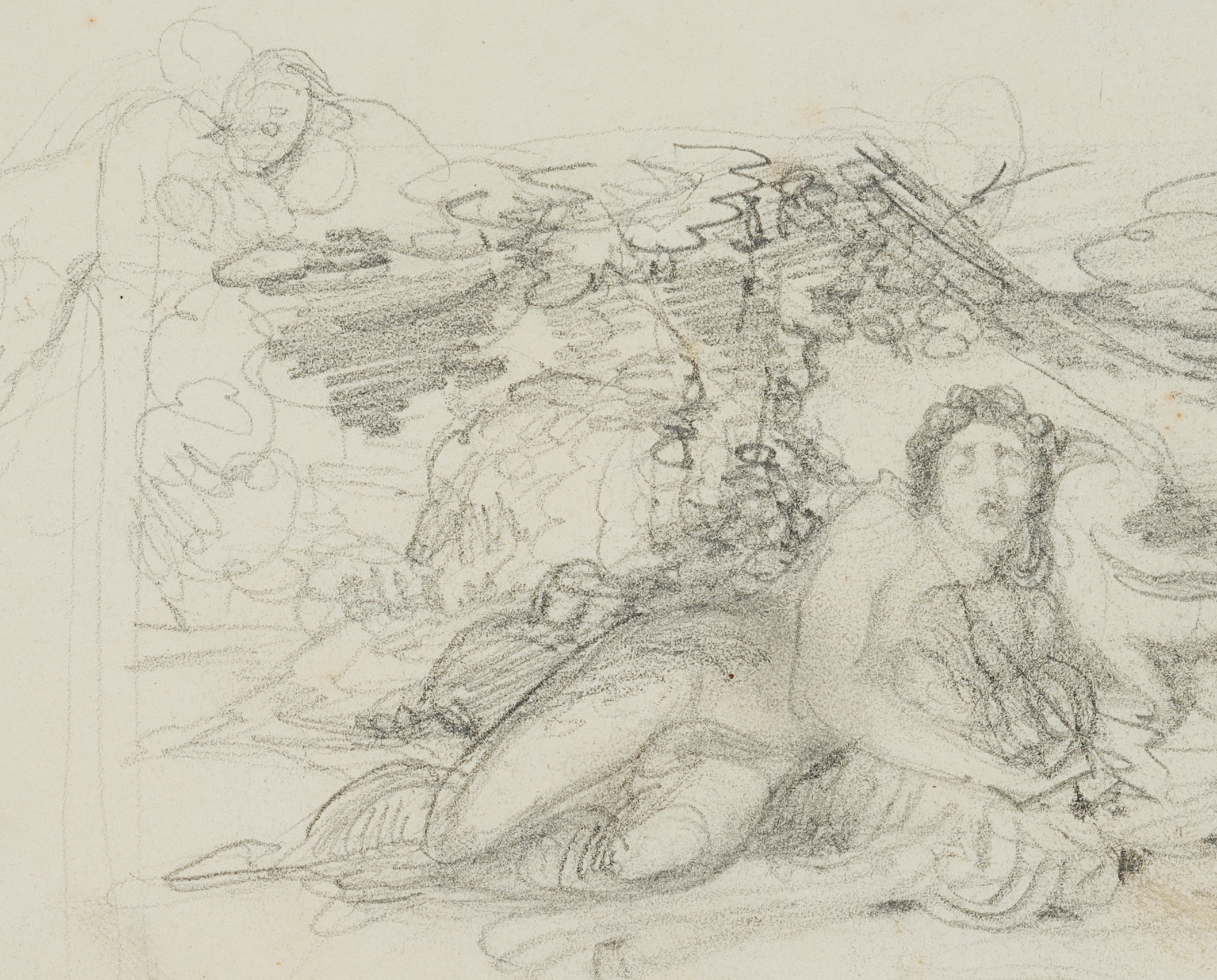 • Description: Sketch of a mythological scene. Under a canopy lies a female figure, perhaps a sleeping Venus? At the top left another figure is indicated, watching the sleeping woman.