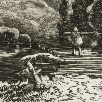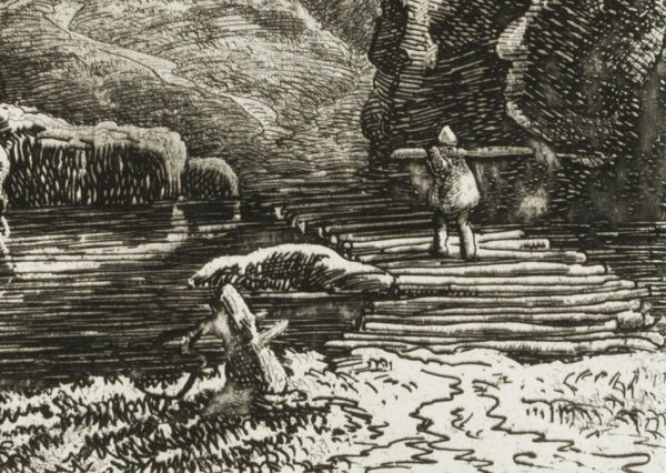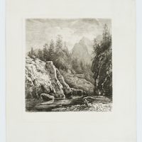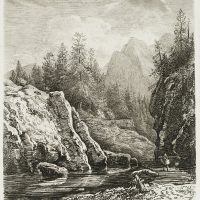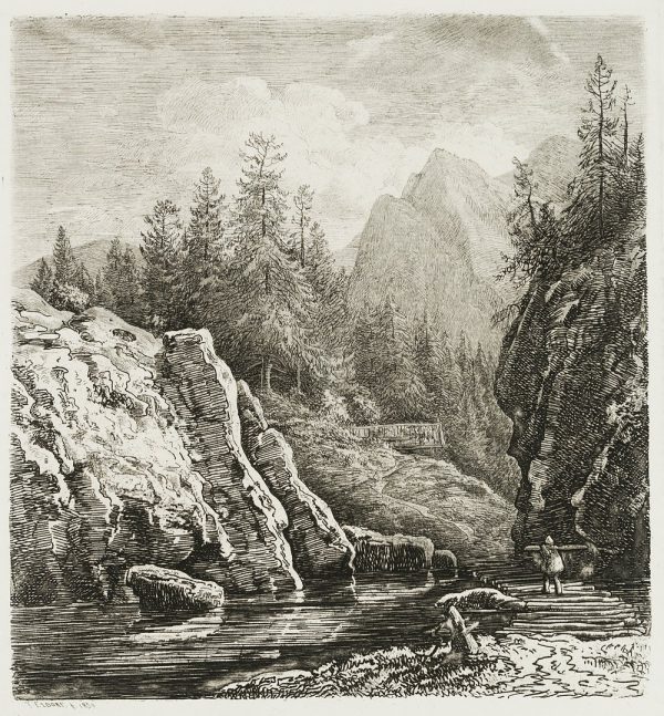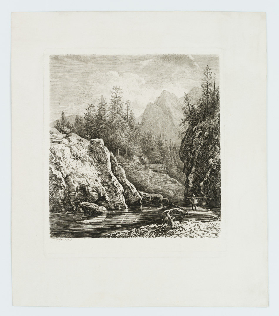 Here the younger Ezdorf shows a winding river landscape surrounded by steep, rocky banks and high rock massifs. A farmer is wading through the river, which was probably swollen in spring by the melting snow in the nearby mountains, over a makeshift bridge of sticks. On his shoulders he carries a long log, perhaps intended for repairing the bridge. Behind the wooded hill the ridge of a mountain hut can be seen, which is to be reached by the bridge and connected with the outside world.The impression of this etching is very strong and clear. Some of the shading has been passed over by a roullette and therefore has a fine pattern that emphasises the flatness of these areas.