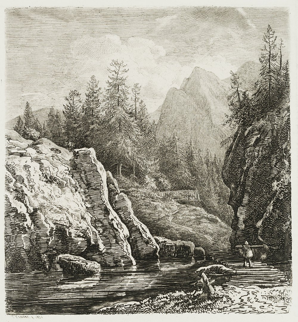 Friedrich Ezdorf (1807 Pößneck – 1858 Würzburg), The farmer on the truncheon bridge in a river valley, 1850, Etching