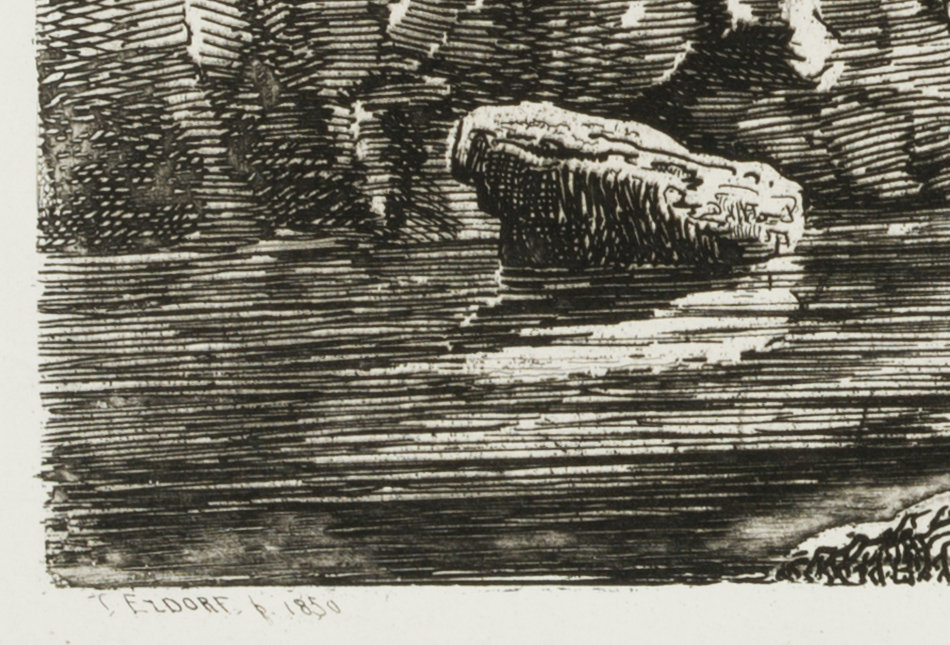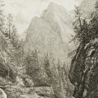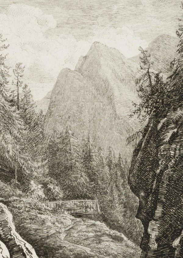 Hier zeigt der jüngere Ezdorf eine verschlungene Flusslandschaft umringt von steilen, felsigen Ufern und hohen Felsmassiven. Durch den, vermutlich zum Frühjahr durch die Schneeschmelze im nahen Gebirge angeschwollenen Fluss watet ein Bauer über eine provisorische Knüppelbrücke. Auf den Schultern trägt er ein langes Rundholz, das vielleicht zur Ausbesserung der Brücke gedacht ist. Hinter dem bewaldeten Hügel ist der First einer Berghütte zu sehen, die durch die Brücke erreicht und mit der Aussenwelt verbunden werden soll. Der Druck dieser Radierung ist sehr kräftig und klar. Die Schattierungen wurden teils durch eine Roullette übergangen und weisen daher ein feines Muster auf, das die Flächigkeit dieser Bereiche betont. - Schlagworte: Tal, Gebirge, Gebirgsfluss, Brücke, Natur, Landschaft, Genre, Deutschland, Romantik, 1850-1899