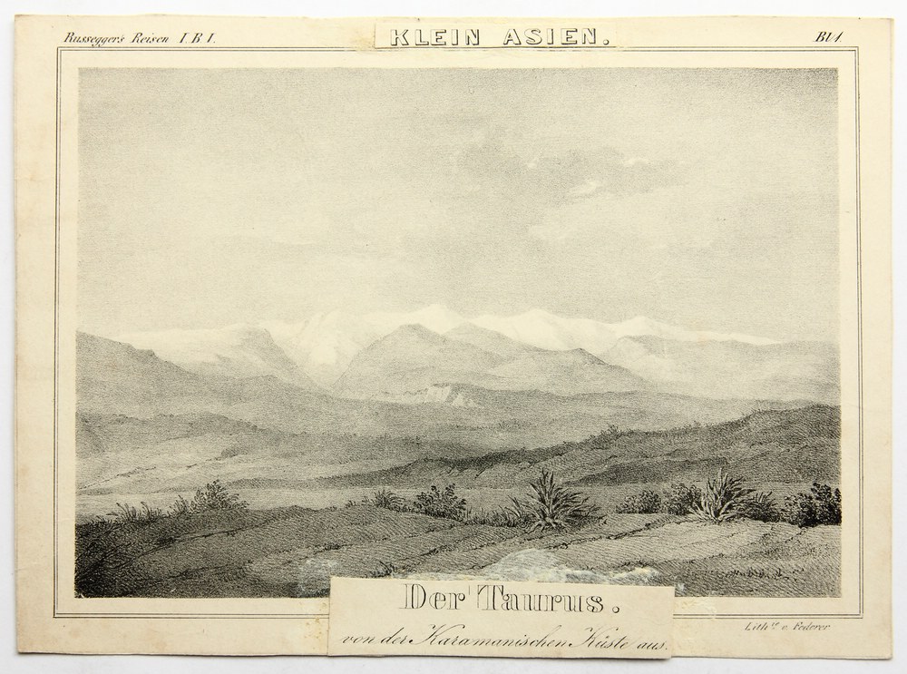 - Bezeichnung: Rechts unten befindet sich im Stein die Signatur des Künstlers. Oberhalb befinden sich die Bezeichnungen “Russeggers Reisen I.B.I.”, “Bl.1”. Auf dem oberen, unteren und rechten Blattrand ist auf aufgeklebten Papierstreifen im Druck der Titel der Darstellung zu sehen. Das Blatt stammt aus einer Reihe von Reiseberichten des österreichischen Geologen Joseph Ritter von Russeggers (1802 Salzburg – 1863 Schemnitz) von Forschungsreisen, die zwischen 1835 und 1841 stattfanden und bis 1850 in mehreren Bänden veröffentlicht wurden. Das vorliegende Blatt stammt vermutlich aus Reisen in Europa, Asien und Afrika. Mit besonderer Rücksicht auf die naturwissenschaftlichen Verhältnisse der betreffenden Länder, unternommen in den Jahren 1835 bis 1841, von Joseph Russegger, k.k. österr. Bergrath etc. [.] Erster Band. Reise in Griechenland, Unteregypten, im nördlichen Syrien und südöstlichen Klei[n]asien, Stuttgart 1843 .