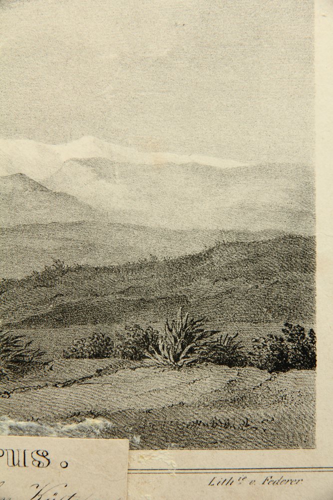 - Inscription: The artist’s signature is in the lower right corner of the stone. Above are the inscriptions “Russeggers Reisen I.B.I.”, “Bl.1”. On the upper, lower and right margins of the sheet the title of the depiction can be seen in print on glued-on paper strips. The sheet is from a series of travelogues by the Austrian geologist Joseph Ritter von Russegger (1802 Salzburg – 1863 Schemnitz) of exploratory journeys, which took place between 1835 and 1841 and were published in several volumes until 1850. The present sheet probably originates from travels in Europe, Asia and Africa. With special regard to the natural history of the countries concerned, undertaken in the years 1835 to 1841, by Joseph Russegger, k.k. österr. Bergrath etc. [.] First volume. Travels in Greece, Lower Egypt, Northern Syria and South-Eastern Asia Minor, Stuttgart 1843.