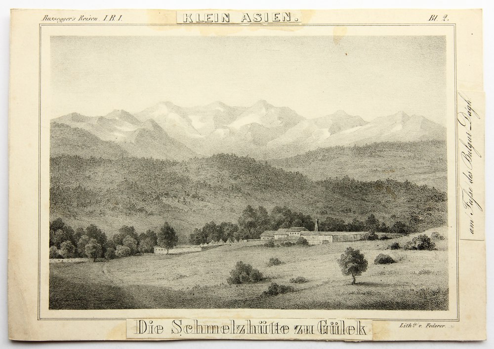 • Bezeichnung: Rechts unten befindet sich im Stein die Signatur des Künstlers. Oberhalb befinden sich die Bezeichnungen “Russeggers Reisen I.B.I.”, “Bl.2”. Auf dem oberen, unteren und rechten Blattrand ist auf aufgeklebten Papierstreifen im Druck der Titel der Darstellung zu sehen. Das Blatt stammt aus einer Reihe von Reiseberichten des österreichischen Geologen Joseph Ritter von Russeggers (1802 Salzburg – 1863 Schemnitz) von Forschungsreisen, die zwischen 1835 und 1841 stattfanden und bis 1850 in mehreren Bänden veröffentlicht wurden. Das vorliegende Blatt stammt vermutlich aus Reisen in Europa, Asien und Afrika. Mit besonderer Rücksicht auf die naturwissenschaftlichen Verhältnisse der betreffenden Länder, unternommen in den Jahren 1835 bis 1841, von Joseph Russegger, k.k. österr. Bergrath etc. [.] Erster Band. Reise in Griechenland, Unteregypten, im nördlichen Syrien und südöstlichen Klei[n]asien, Stuttgart 1843 .
