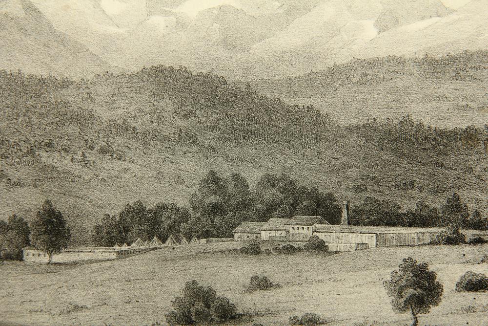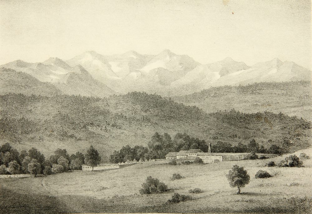 Stimmungsvolle Landschaftsdarstellung mit Blick auf eine imposante Gebirgskette hinter bewaldeten Hügeln. Vorne sind die niedrigen Gebäude einer Schmelzhütte zu sehen, in der im 19. Jahrhundert Bleierze verhüttet wurden.