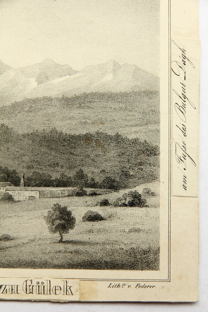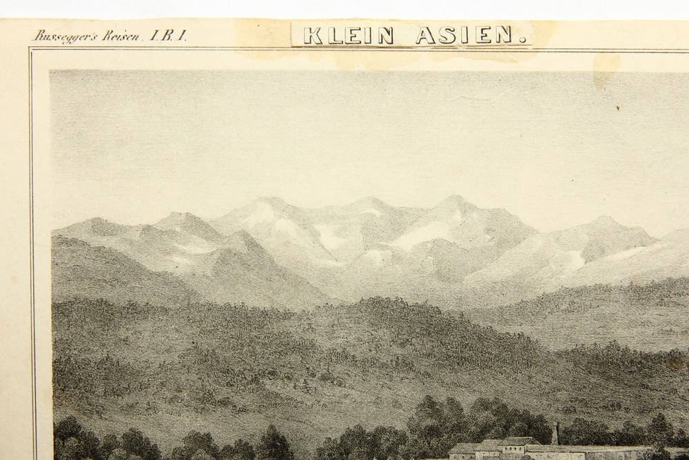 • Inscription: The artist’s signature is in the lower right corner of the stone. Above are the inscriptions “Russeggers Reisen I.B.I.”, “Bl.2”. On the upper, lower and right margins of the sheet the title of the depiction can be seen in print on glued-on paper strips. The sheet is from a series of travelogues by the Austrian geologist Joseph Ritter von Russegger (1802 Salzburg – 1863 Schemnitz) of exploratory journeys, which took place between 1835 and 1841 and were published in several volumes until 1850. The present sheet probably originates from travels in Europe, Asia and Africa. With special regard to the natural history of the countries concerned, undertaken in the years 1835 to 1841, by Joseph Russegger, k.k. österr. Bergrath etc. [.] First volume. Travels in Greece, Lower Egypt, Northern Syria and South-Eastern Asia Minor, Stuttgart 1843.