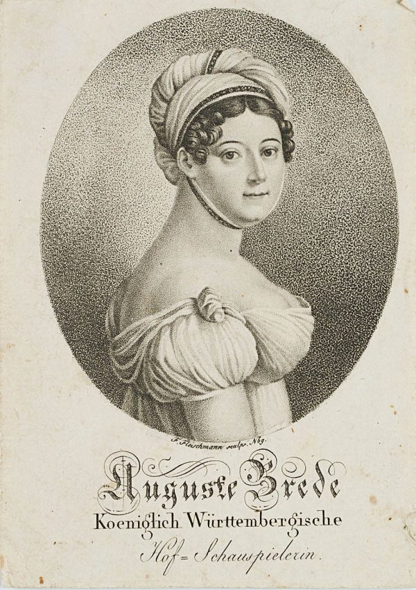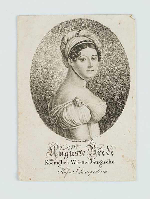 - Bezeichnung: Unten signiert: “F. Fleischmann sculps. Nbg.”, darunter bezeichnet “Auguste Brede. Koeniglich Württembergische. Hof = Schauspielerin”.
