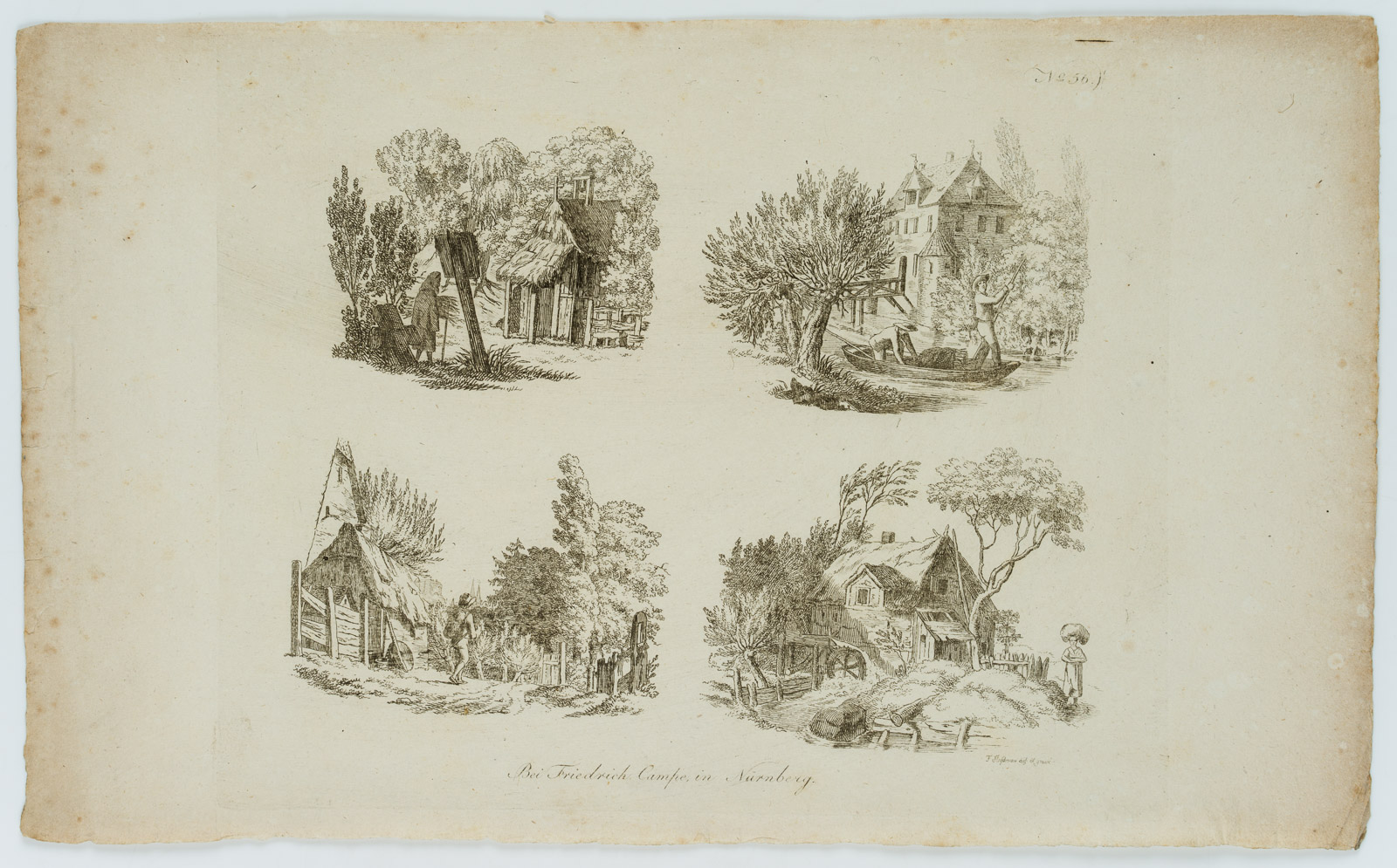 - Inscription: Signed on the right below the image: “F. Fleischmann des.et gravé”, inscribed in the centre below: “Bei Friedrich Campe in Nürnberg; numbered “No. 56.” in the upper right corner of the printing plate; inscribed on the verso with the artist’s life data. Friedrich Fleischmann was a German painter, graphic artist and engraver. He is also regarded as an important steel engraver who was the first to introduce this reproduction technique in the Nuremberg school of engraving. Friedrich Fleischmann created almost 2000 engravings, most of them directly “[…] from nature”, which “[…] are of value because of their striking conception”. Four landscape depictions with a water mill, hikers in the landscape and two rowers on a boat.