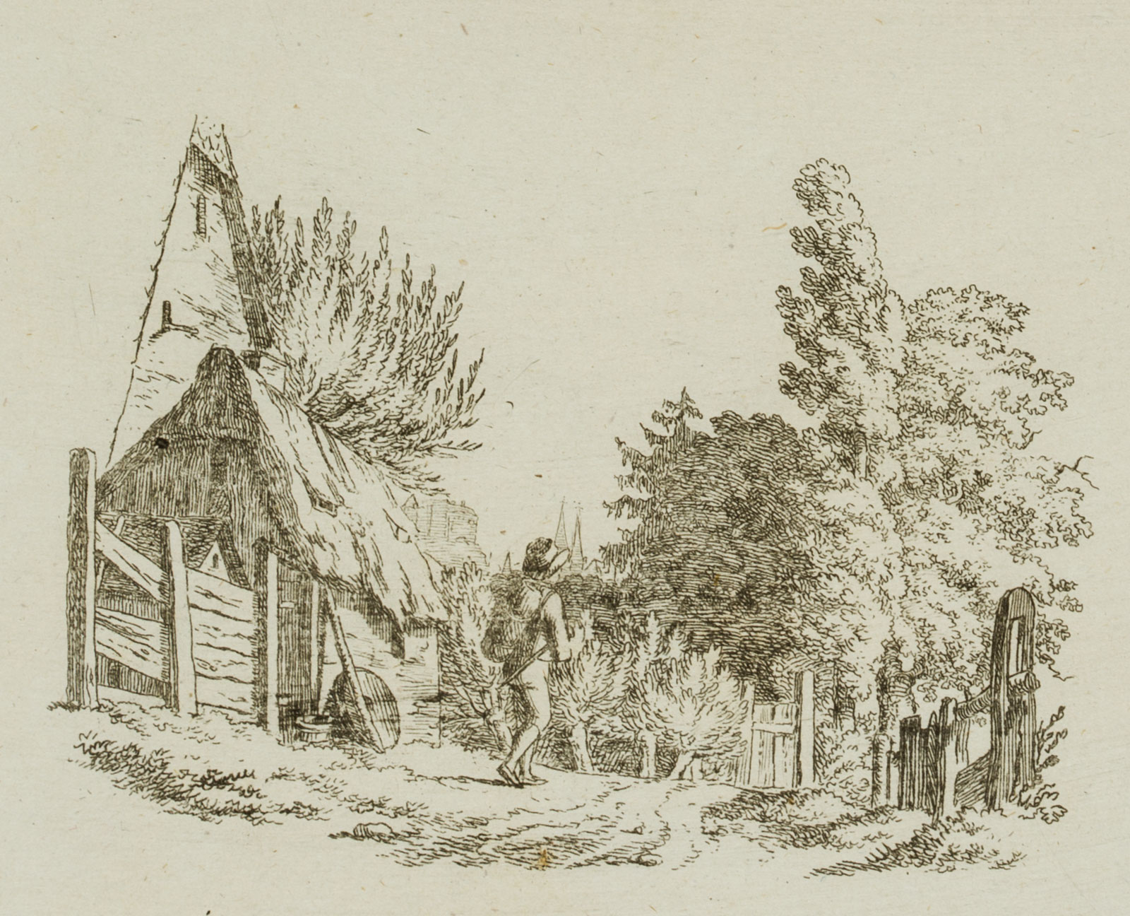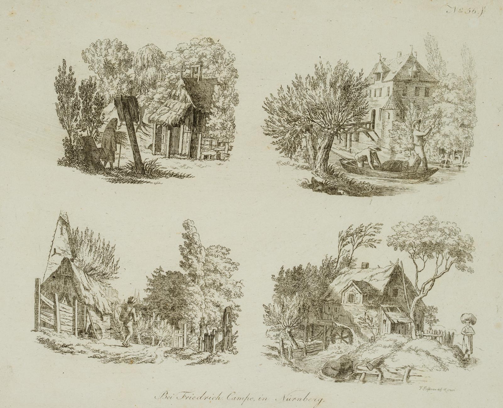 Friedrich Fleischmann (1791 Nürnberg – 1834 München), Vier Landschaftsdarstellungen mit einfachen Hütten und Gutshof, 19. Jahrhundert, Radierung