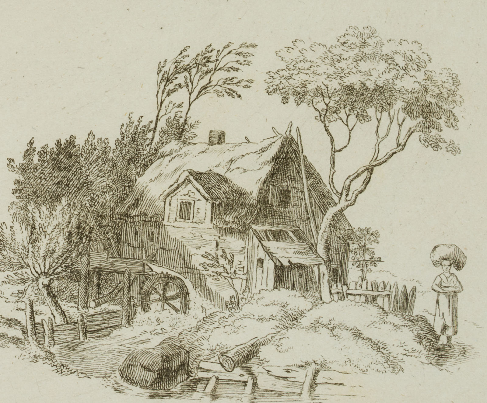 Friedrich Fleischmann (1791 Nuremberg – 1834 Munich), Four landscape depictions with simple huts and manor house, 19th century, Etching