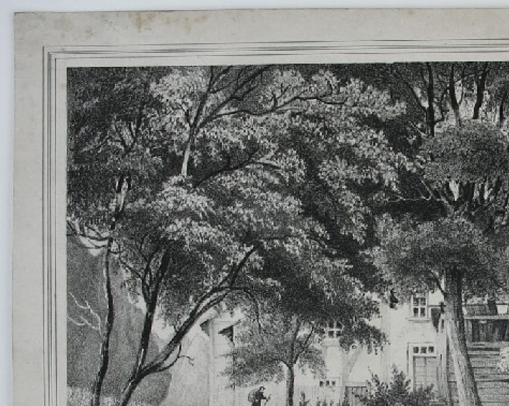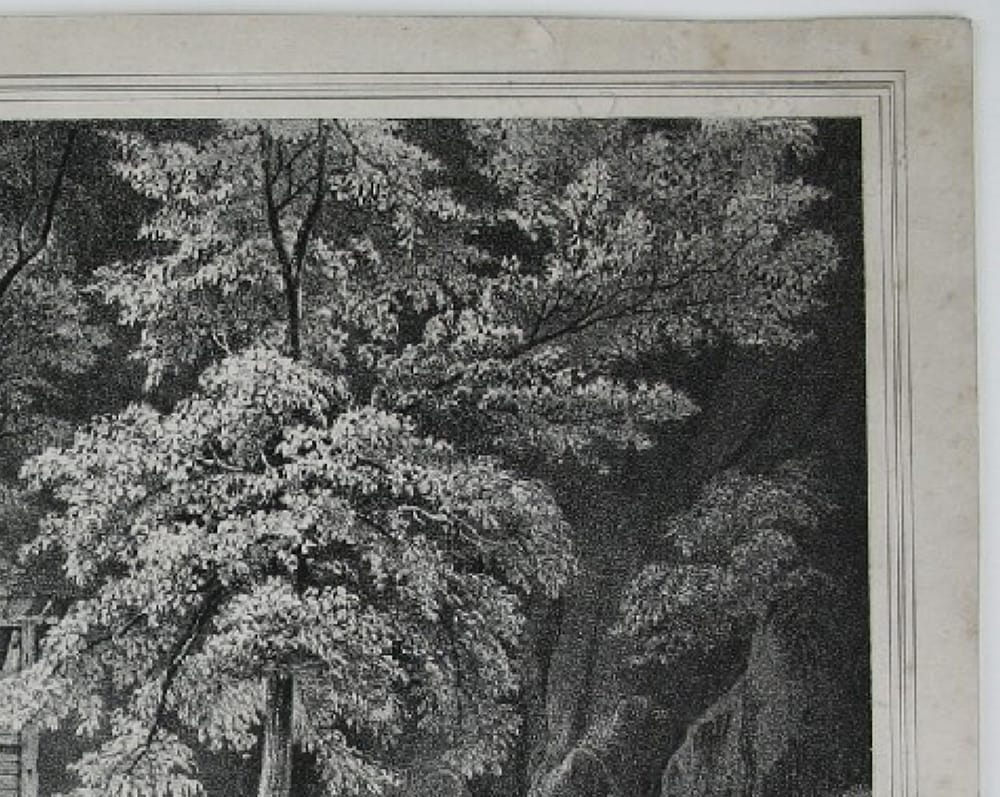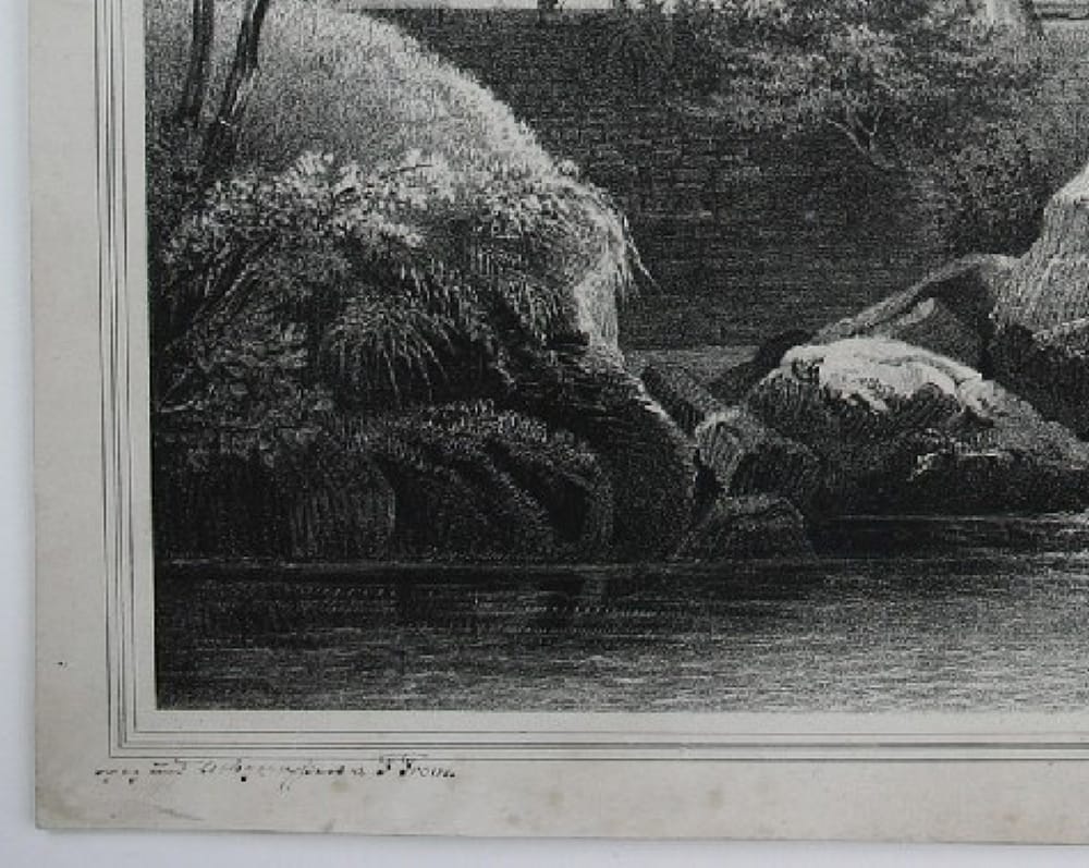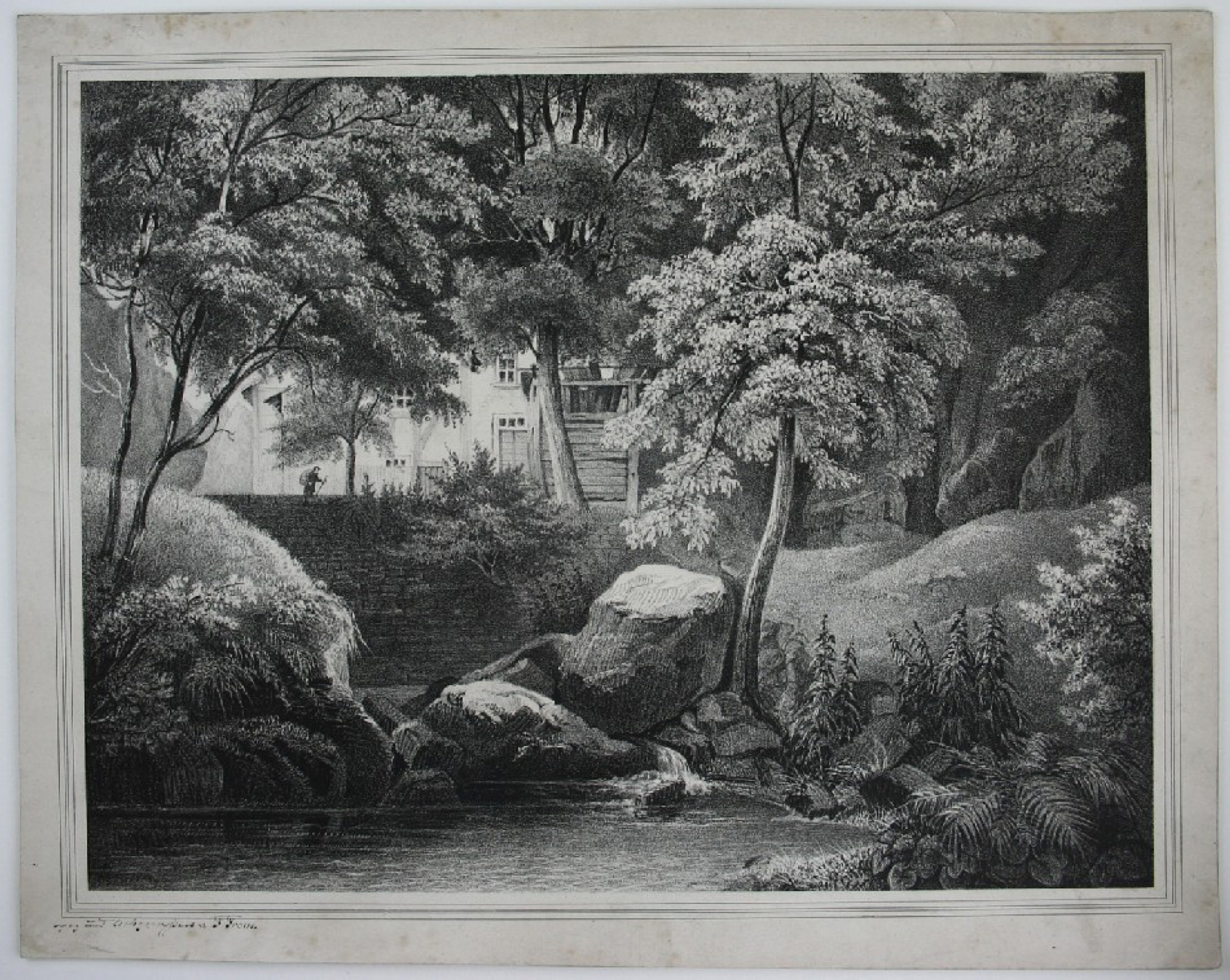 - Description: Lithograph by F. From, inscribed lower left in pen and black: “gez. und lithographiert von F. From”. Idyllic scene in the forest. Surrounded by ferns and large rocks lies a pond in the forest. Tall deciduous trees shade its slightly rippled surface. In the background, a hiker approaches a house that is almost hidden among the trees.