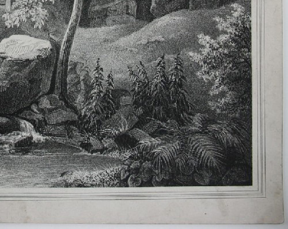 - Beschreibung: Lithografie von F. From, bezeichnet unten links mit Feder in schwarz: “gez. und lithographiert von F. From”. Idyllische Szene im Wald. Umgeben von Farnen und großen Felsen liegt ein Weiher im Wald. Hohe Laubbäumen beschatten seine leicht gekräuselte Oberfläche. Im Hintergrund nähert sich ein Wanderer einem Haus, das zwischen den Bäumen beinahe verborgen liegt.