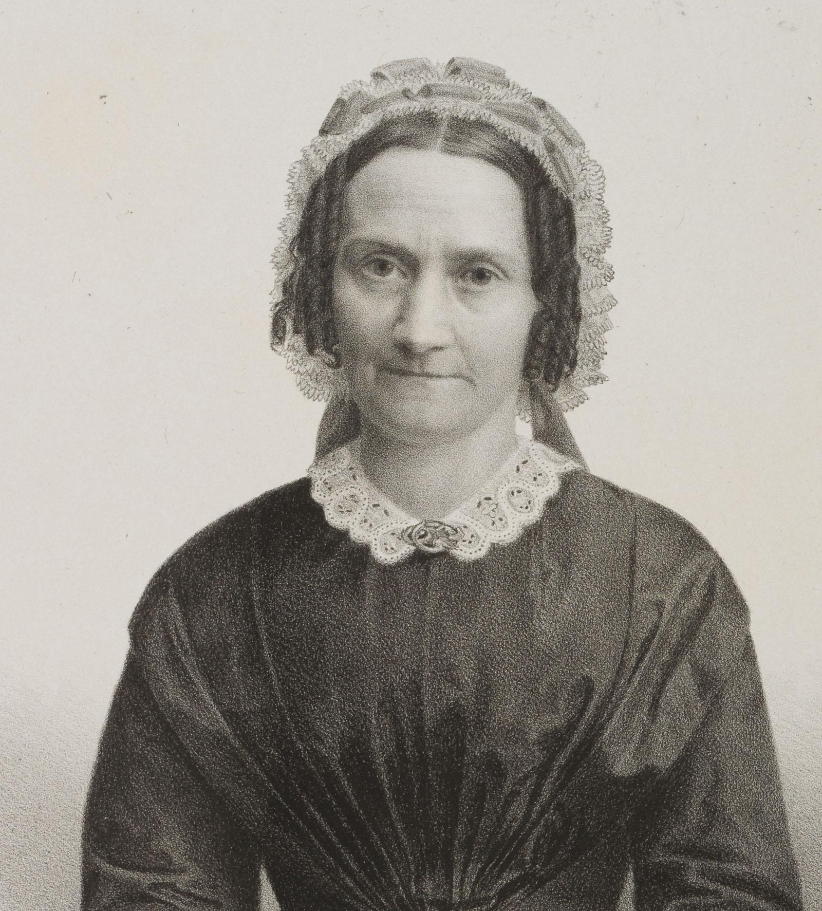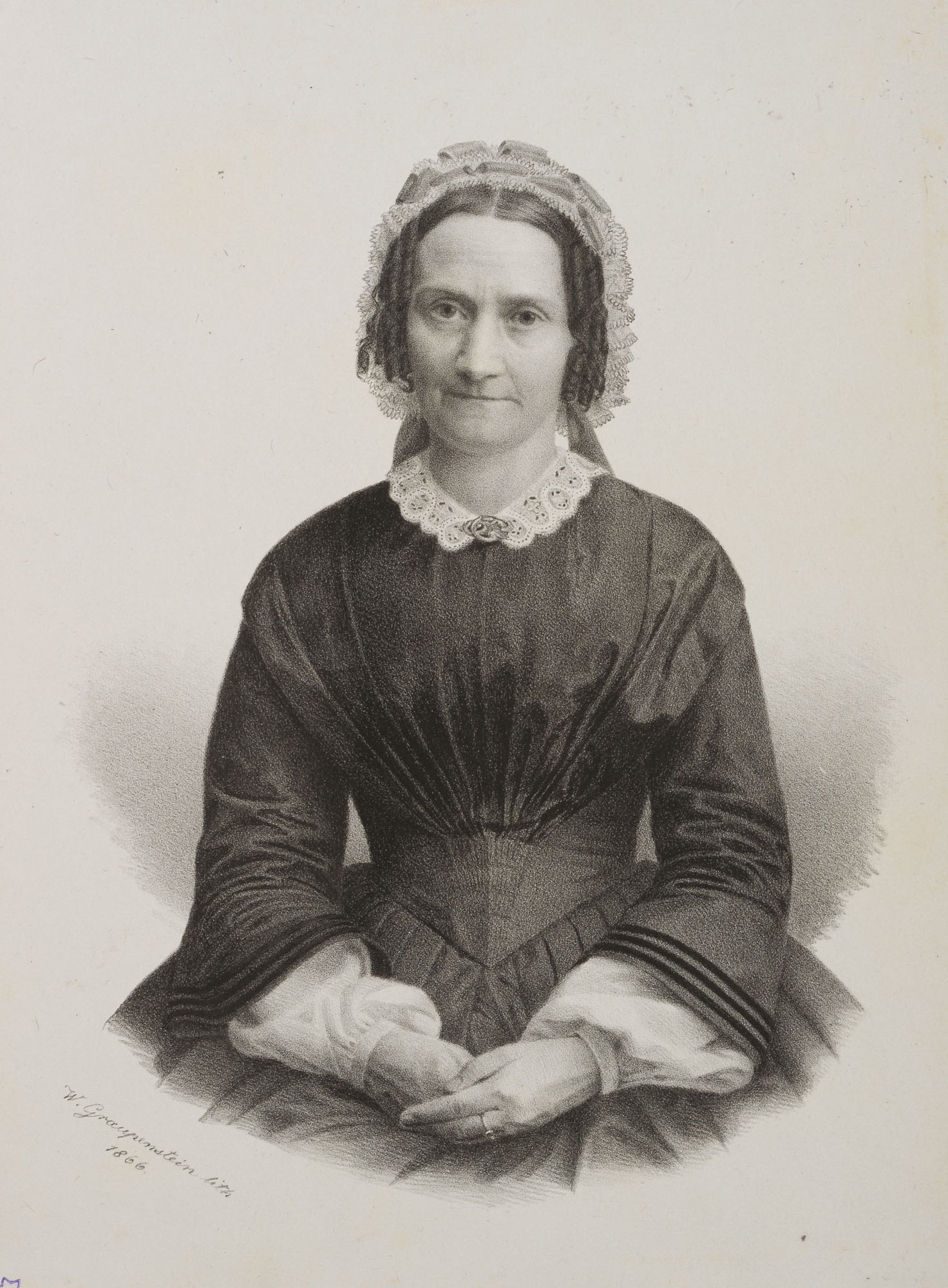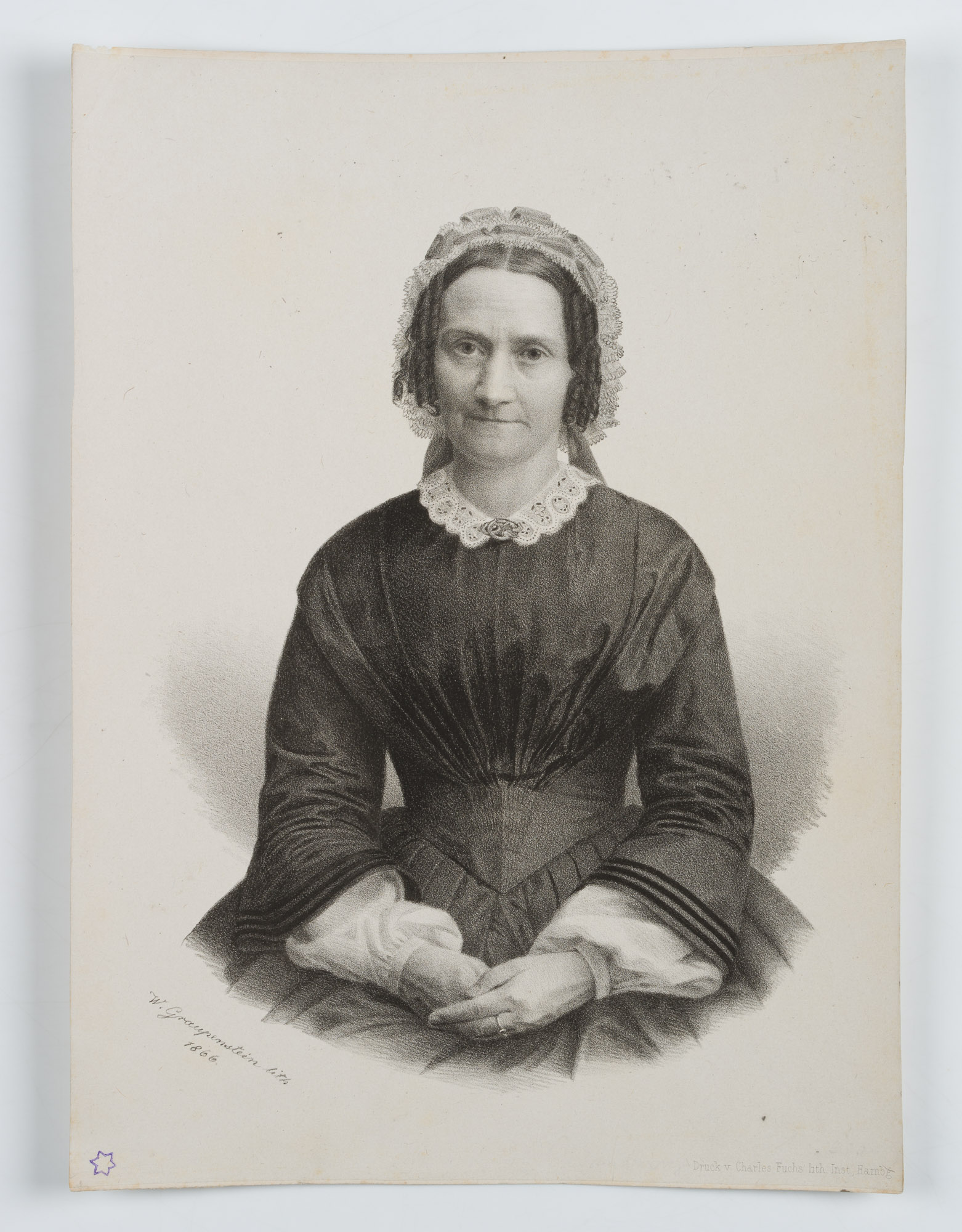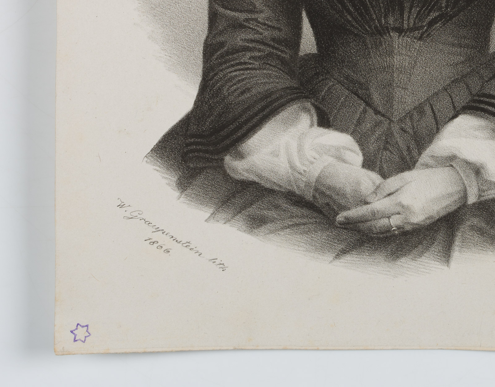 Friedrich Wilhelm Graupenstein (1828 Minden – 1897 Hamburg), Hüftbildporträt der Elisabeth Schröder. Ehefrau des Hamburger Kaufmanns Hans Joachim Schröder. Im Kleid mit Haube, die Hände ineinander gefaltet, frontal mit Blick hin zum Betrachter, 1866, Lithographie