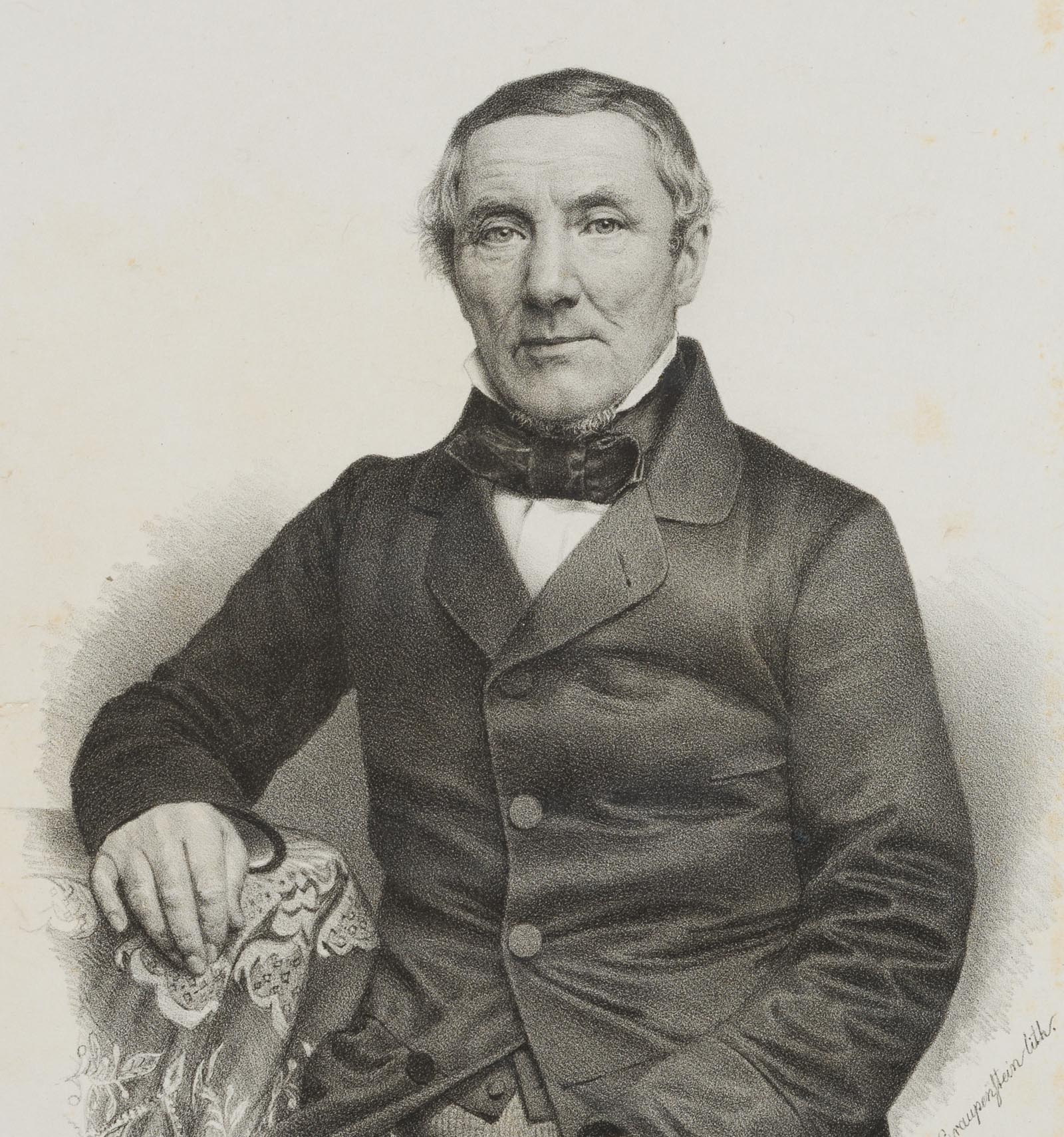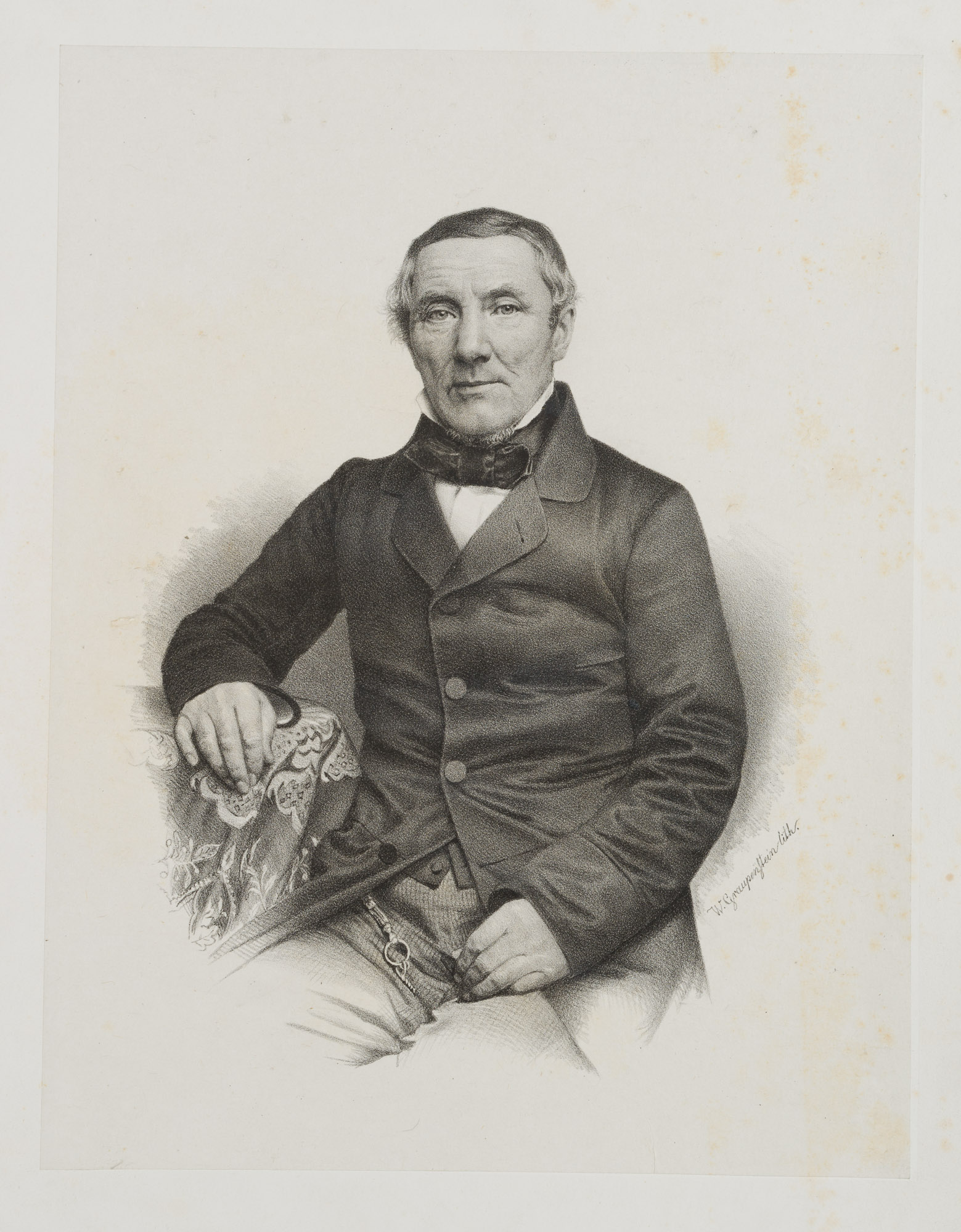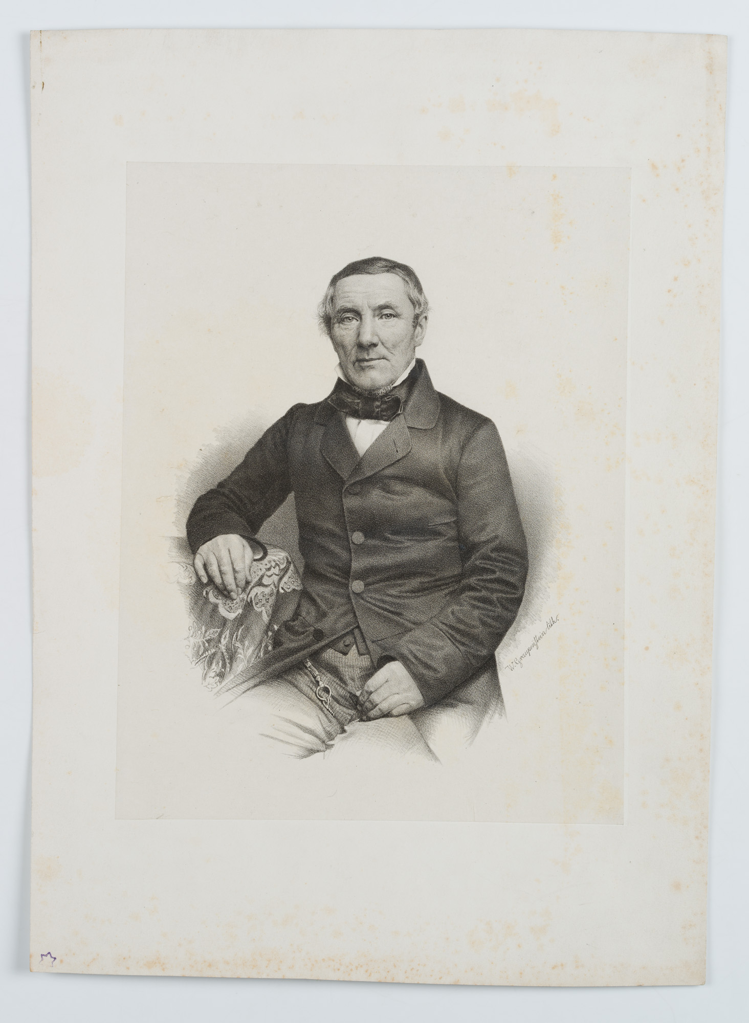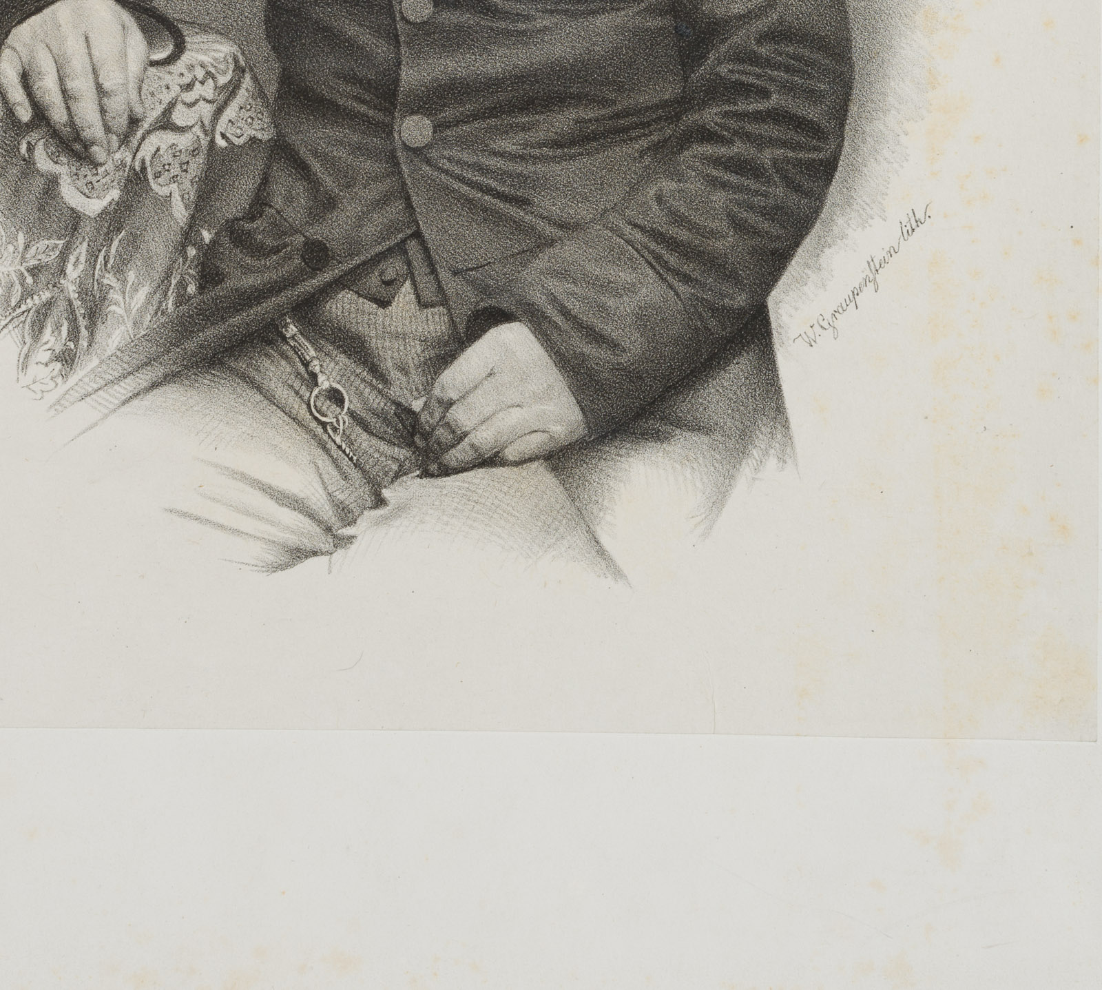 Friedrich Wilhelm Graupenstein (1828 Minden – 1897 Hamburg), Hüftbildporträt eines Herren im Mantel mit Hemd, Weste und Fliege, seinen rechten Arm auf eine Tischplatte mit Tischtuch stützend, sein Blick gilt dem Betrachter, um 1860, Lithographie