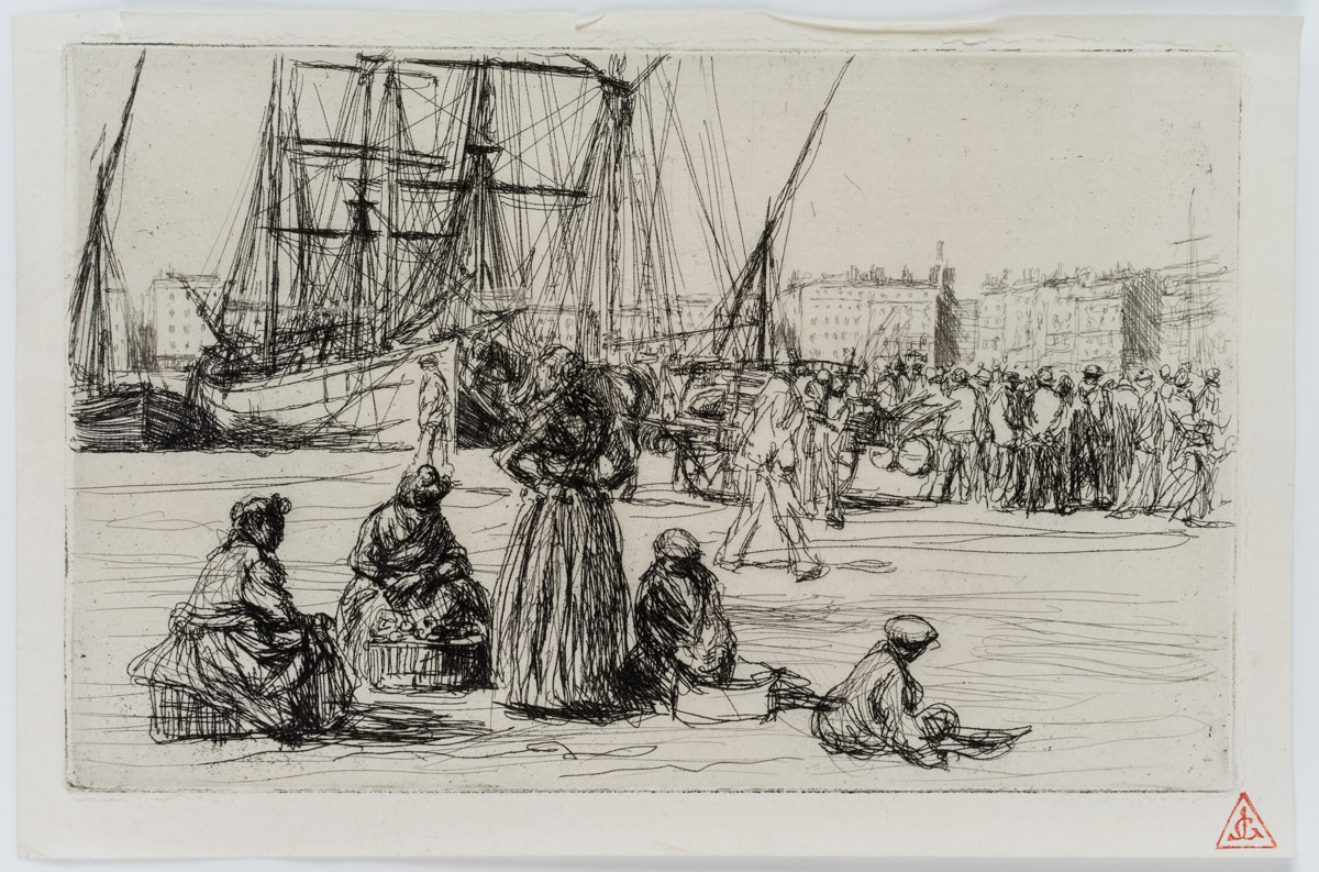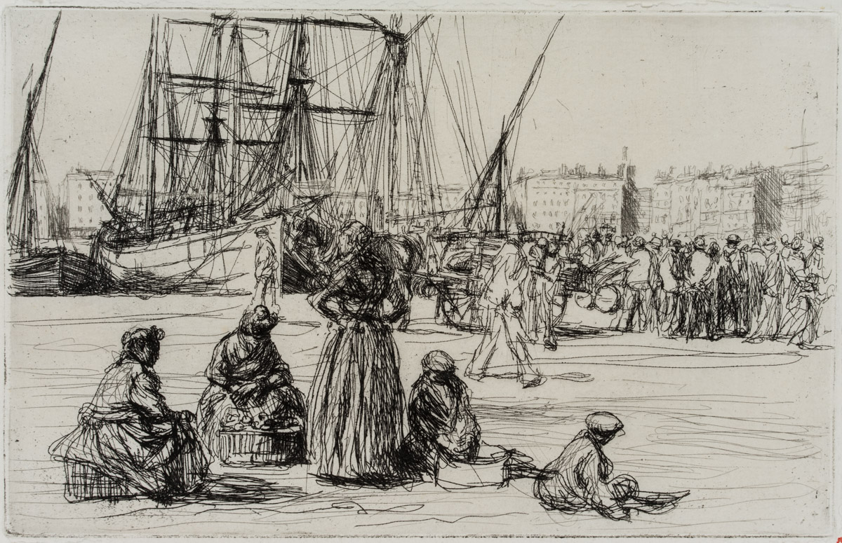 - Beschreibung: Meisterhafte Genredarstellung aus dem Umkreis des berühmten Graphikers Francis Seymour Haden, dessen Stil schnell gezogener Linien auch in diesem Blatt sehr gut zur Geltung kommt. Besonders die Takelage der im Hafenbecken vertäuten Schiffe zeichnet sich durch die Präzision der Nadelführung aus, die dem Gewirr der Taue Regelmäßigkeit und Geradlinigkeit verleiht. Im Vordergrund ist eine Gruppe Arbeiterfrauen zu sehen, die wartend am Quai sitzen.