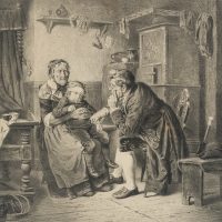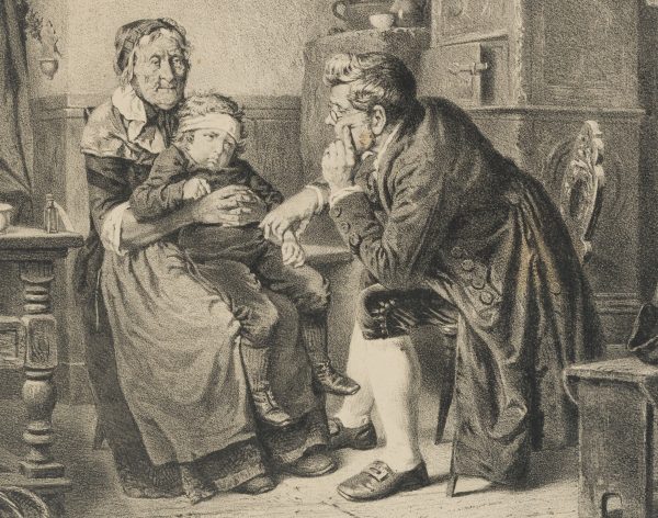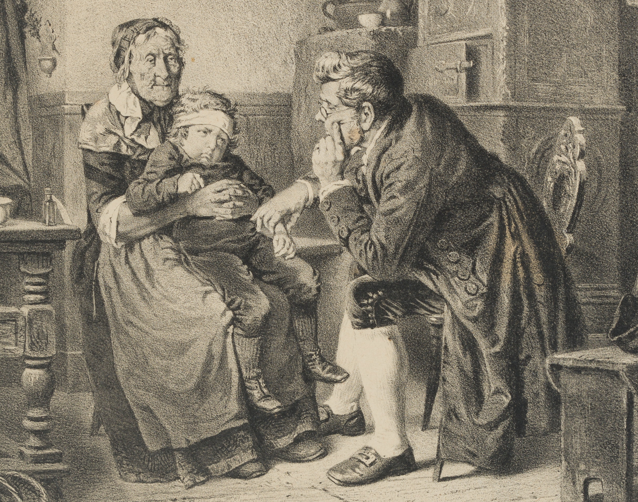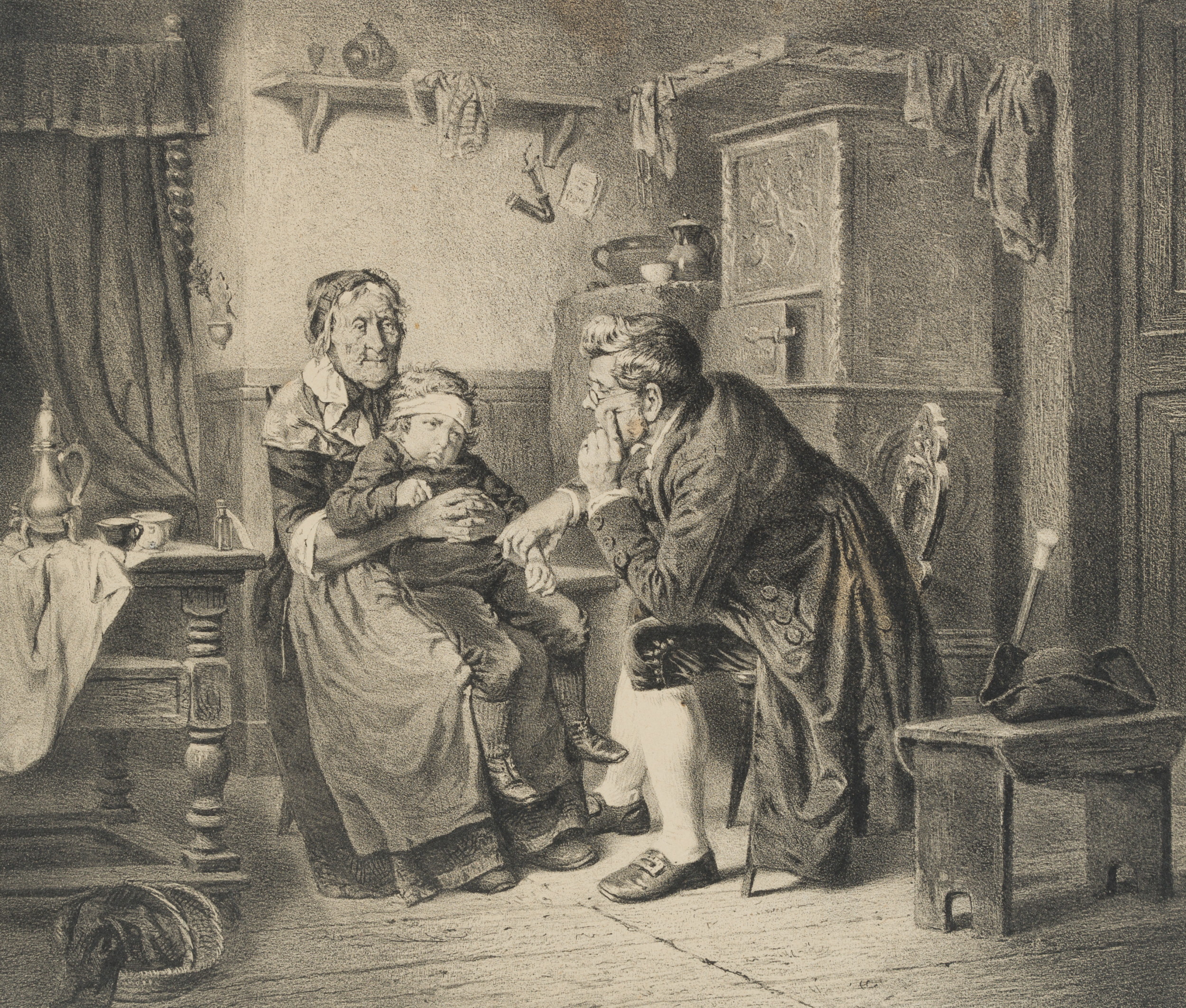 Friedrich Peter Hiddemann (1829 – 1892 ), The Doctor Interior of a farmhouse parlour with sick child, doctor and grandmother, c. 1850, Lithography with chalk