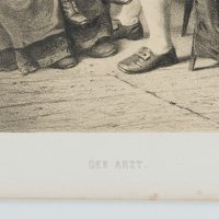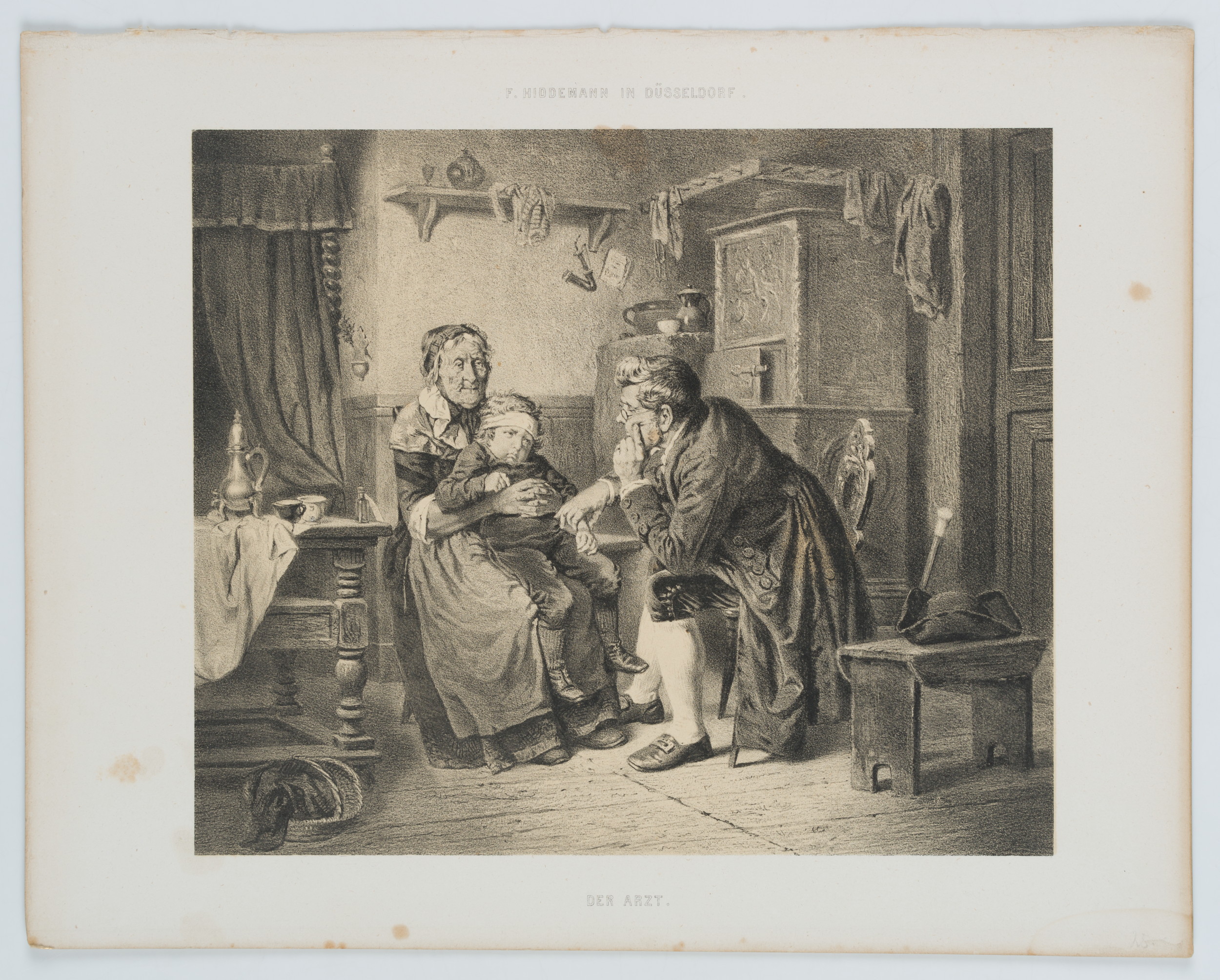 Friedrich Peter Hiddemann (1829 Düsseldorf – 1892 ebd.), Der Arzt. Interieur einer Bauernstube mit krankem Kind, Arzt und Großmutter, um 1850, Kreidelithographie