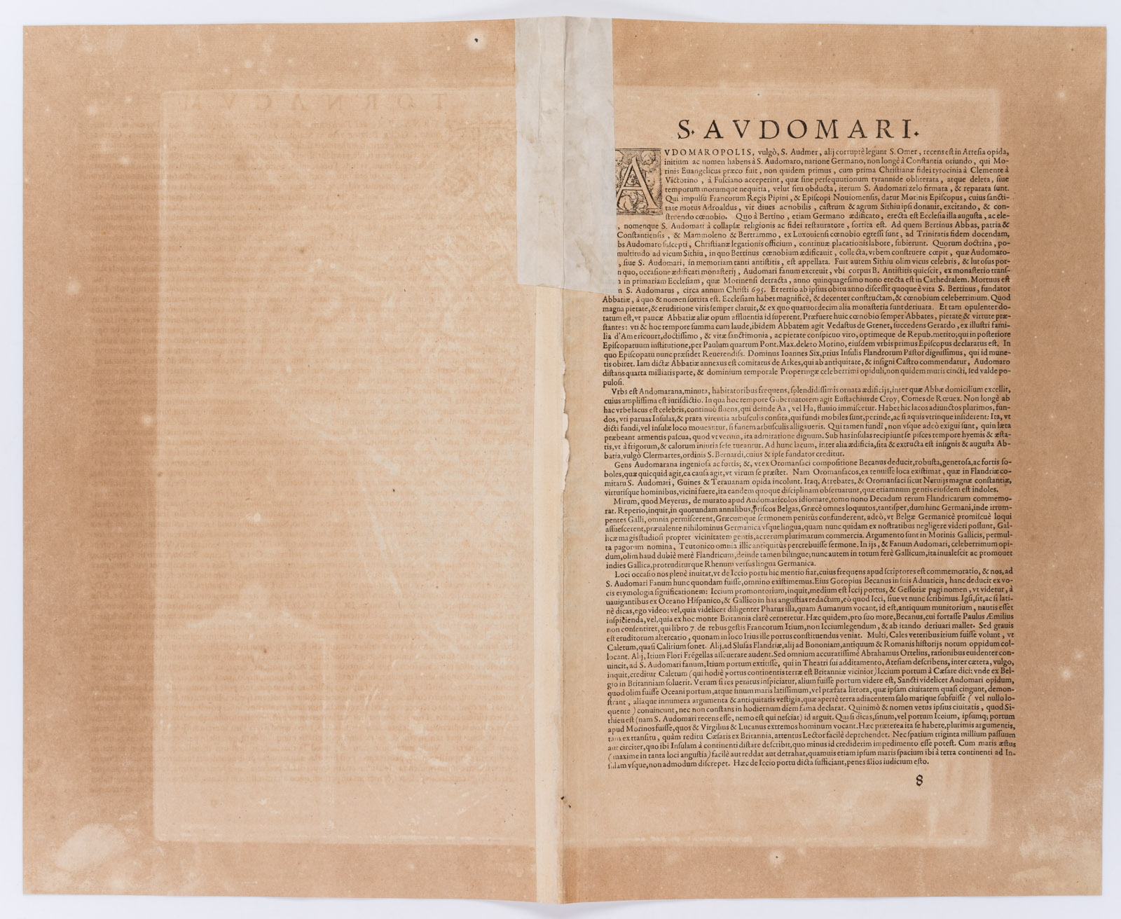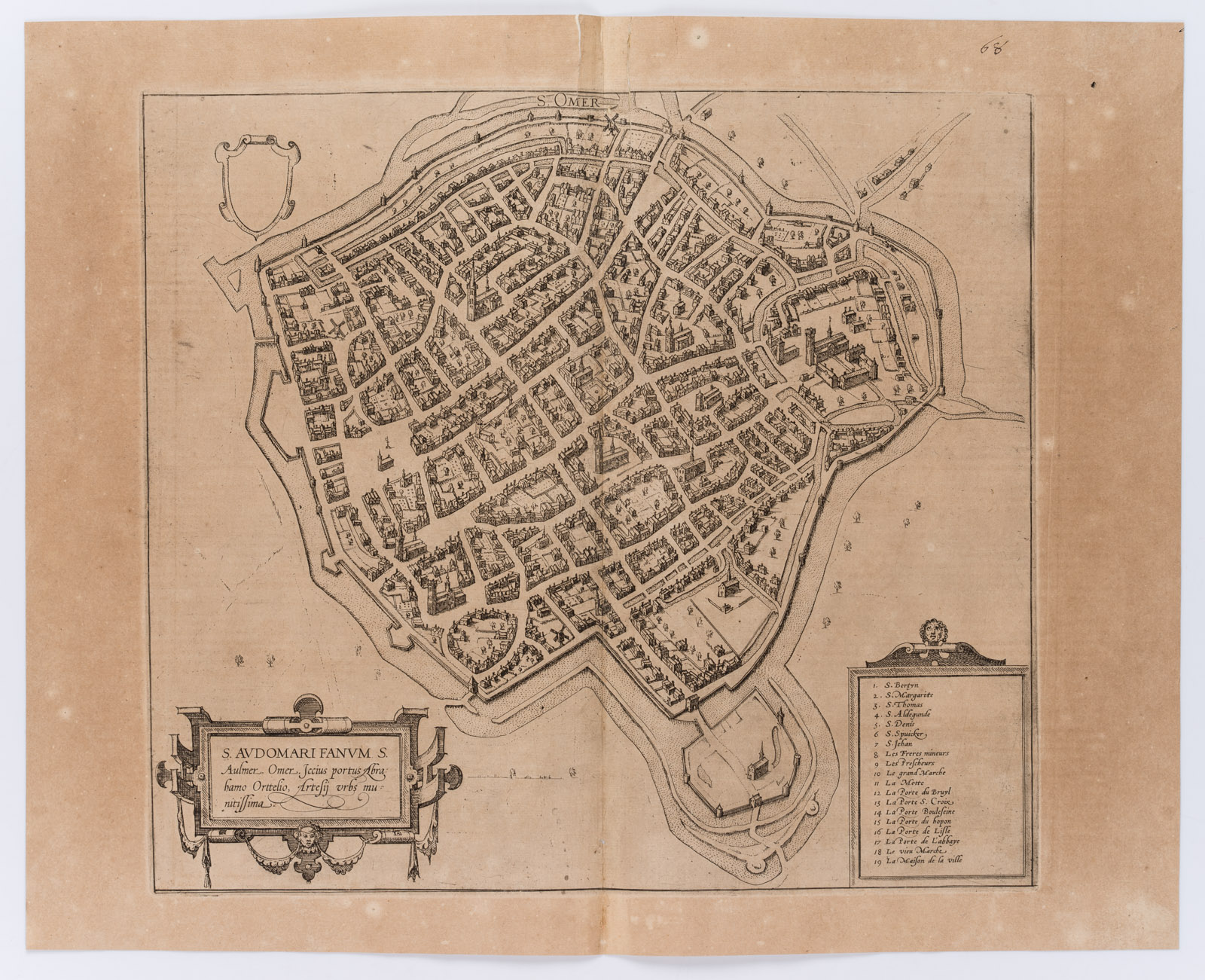 - Bezeichnung: Unten links in der Druckplatte bezeichnet: “S. Audomari Fanum, S. Ausmer, Omer. Iccius portus Abrahamo Orttelio, Artesi urbs munitissima”. Verso lateinischsprachiger Text: “S.Audomari”.